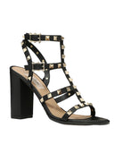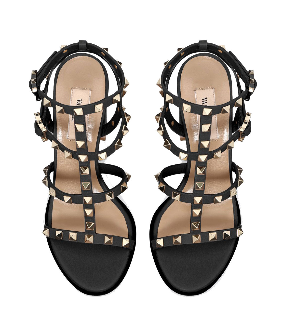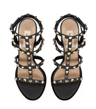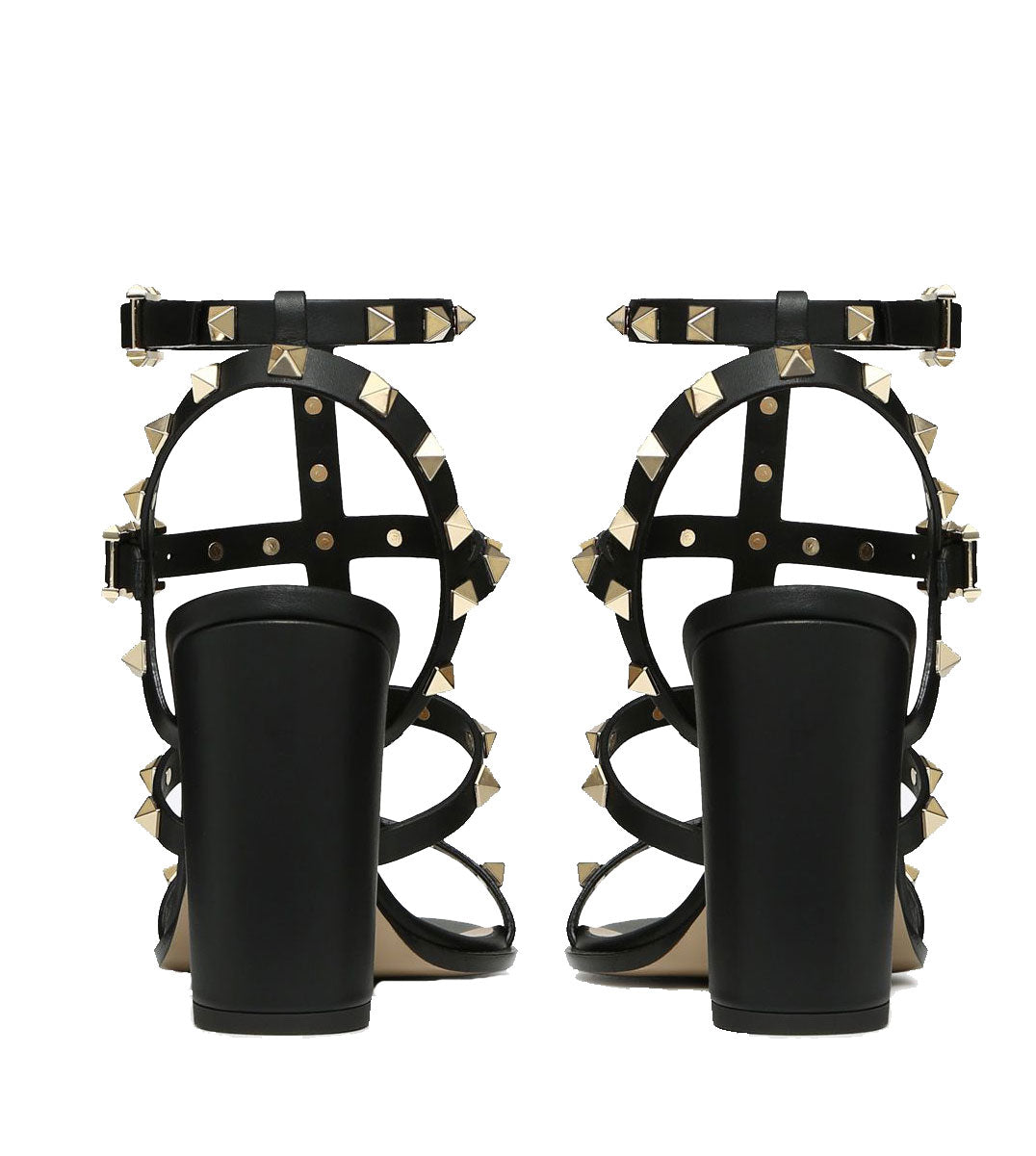 Valentino Garavani Rockstud Sandal in black Leather with Platinum gold finish studs. Open toe and covered block heel. Adjustable straps.
