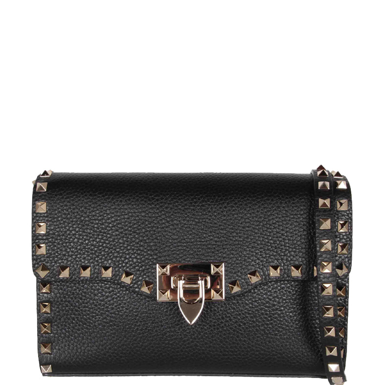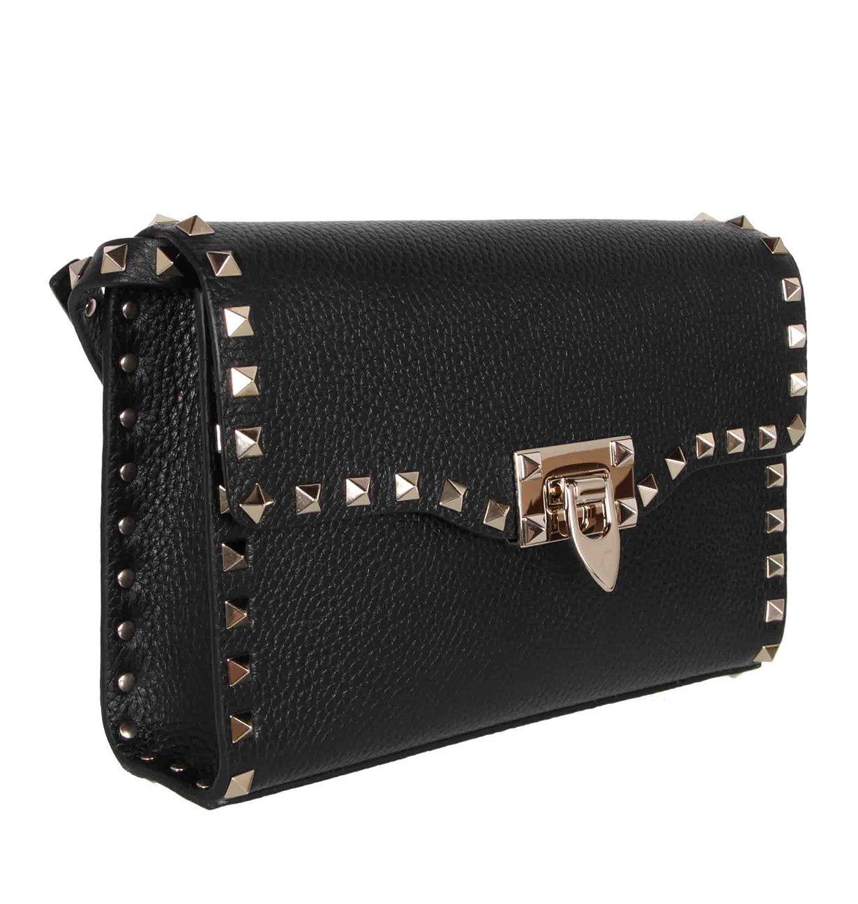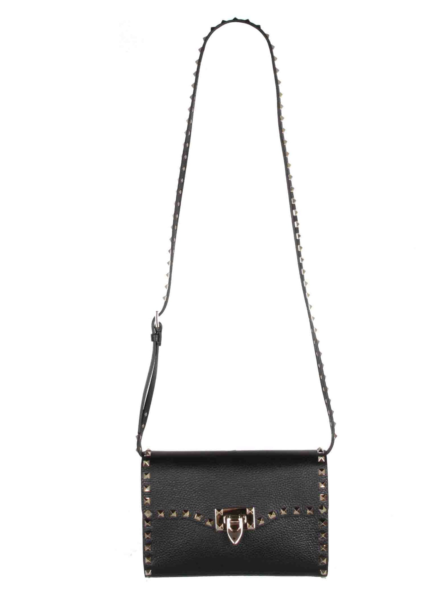 Valentino Garavani Rockstud rectangular shoulder bag from Valentino featuring a foldover top with flip-lock closure, platinum rockstud embellishments and buckle fastening. Finished with an adjustable and removable shoulder strap, an internal logo patch and a main internal compartment.