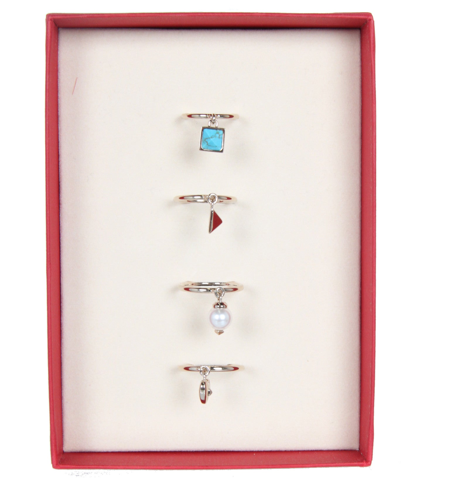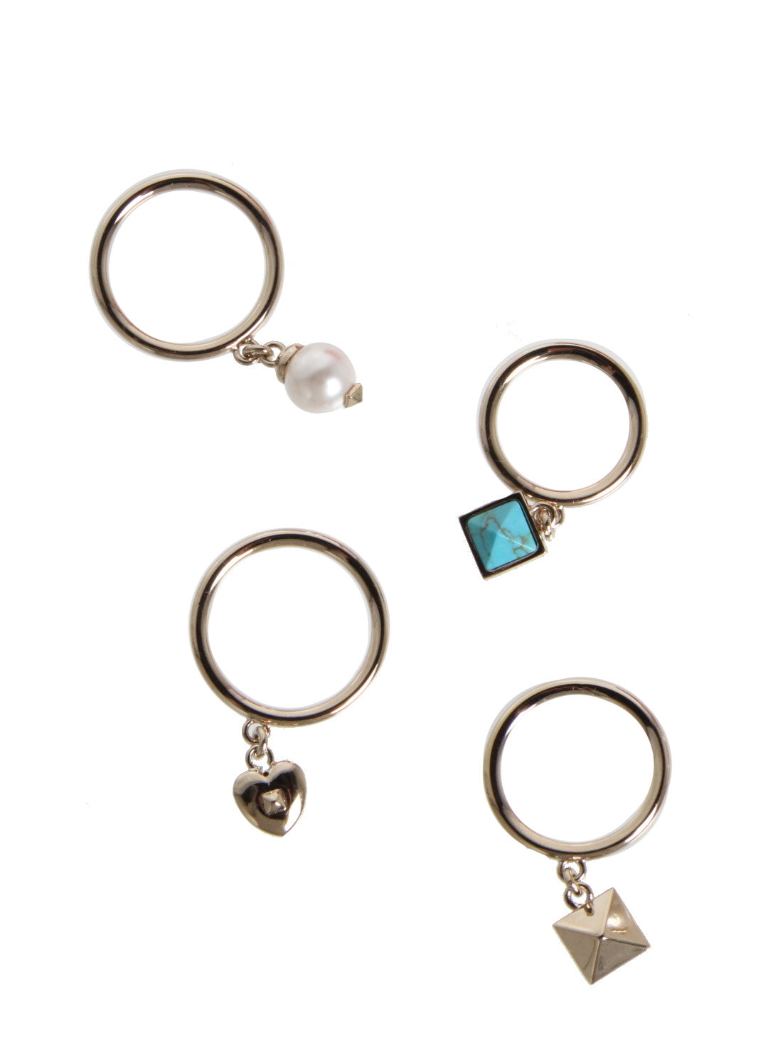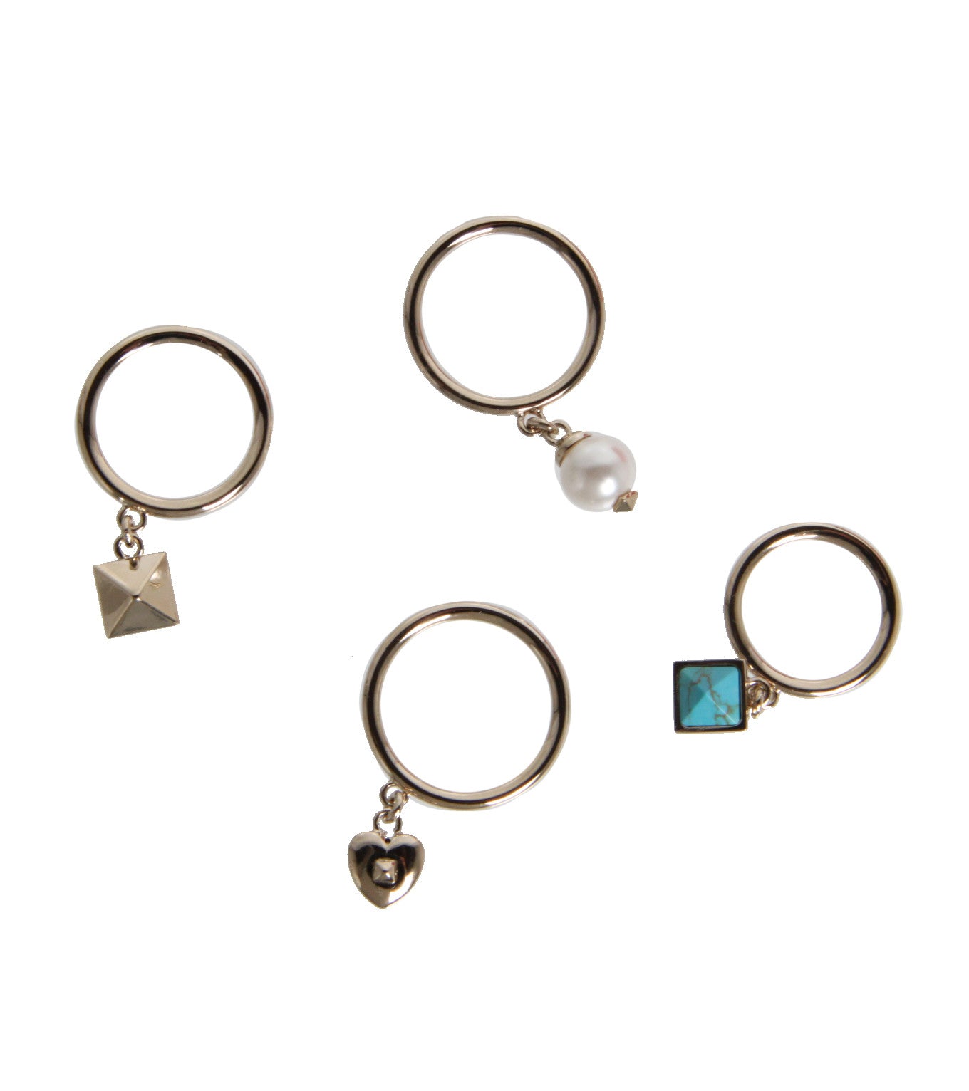 This four ring set from Valentino Garavani is designed to be worn together or separately. Crafted from pale gold-tone brass with glass pearl accents, these pieces are crafted in different styles finished with Rockstud detailing. The rings vary in size and are designed to be worn from the pinky to to pointer finger. Please determine size set in relation to your ring finger.