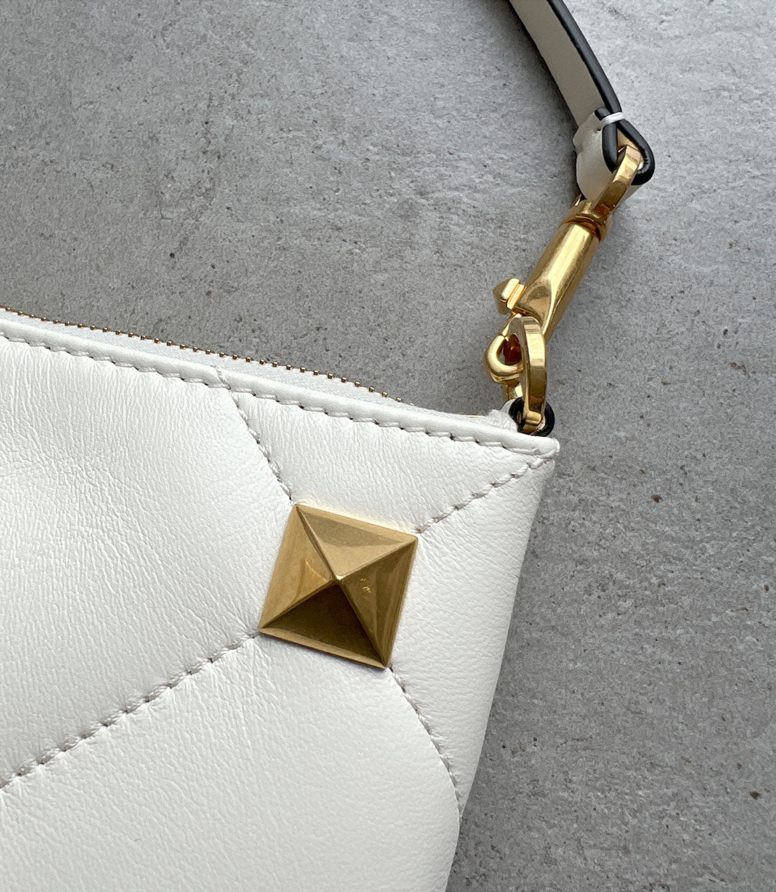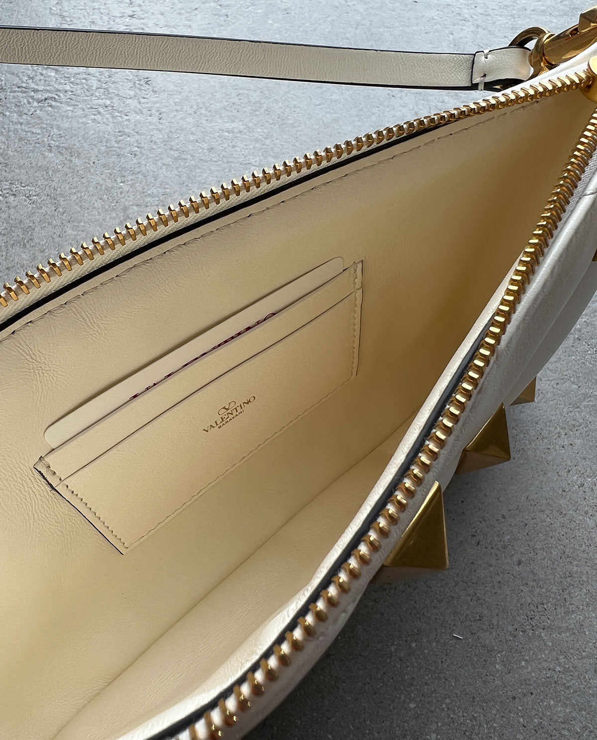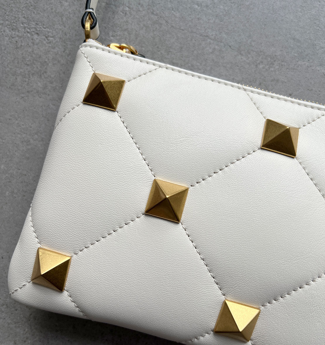 Valentino Garavani Roman Stud pouch in ivory quilted lambskin nappa with gold-tone maxi studs. It features a wristlet/shoulder strap, zip closure, leather lined with one main interior compartment and two interior card slots.