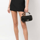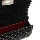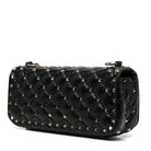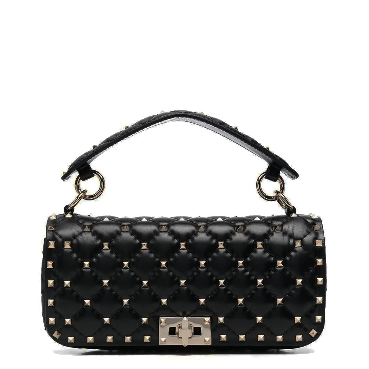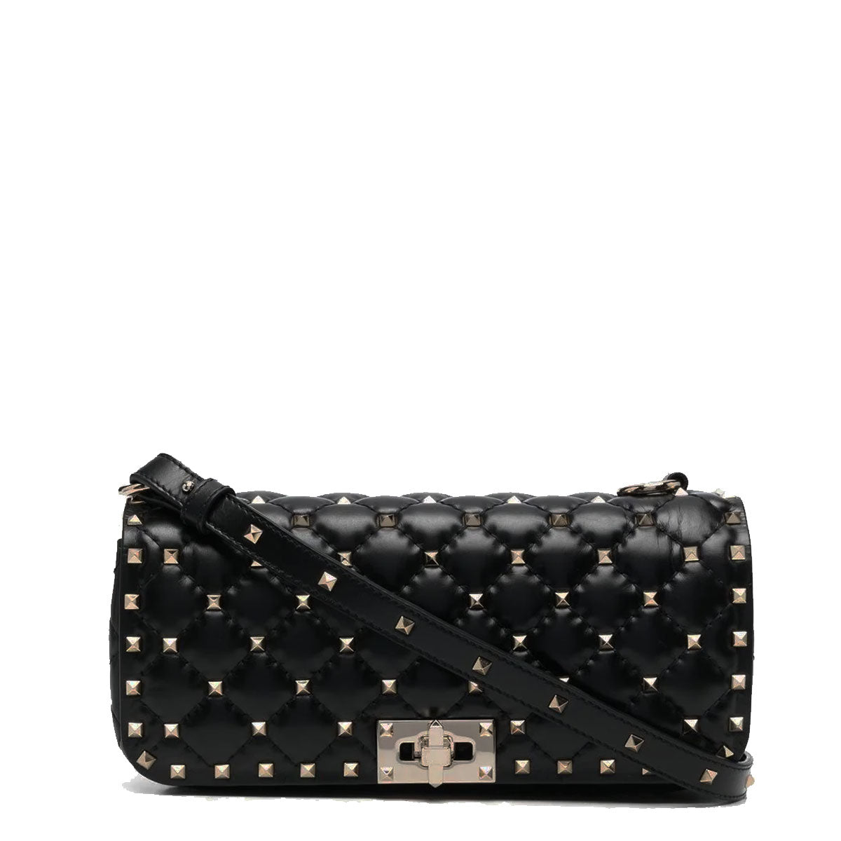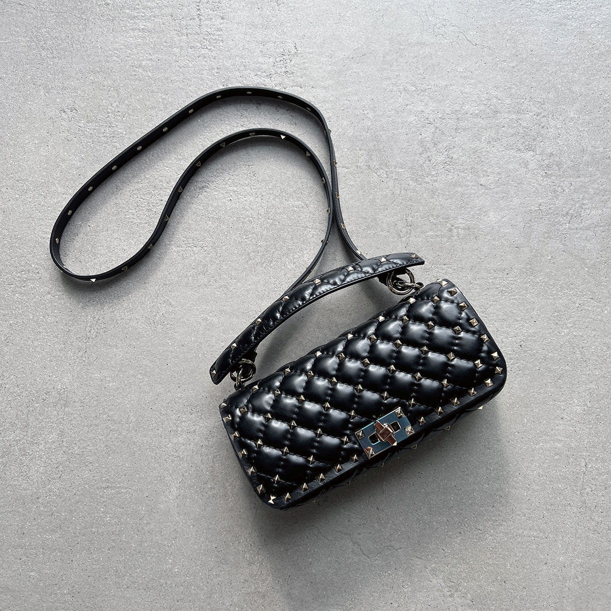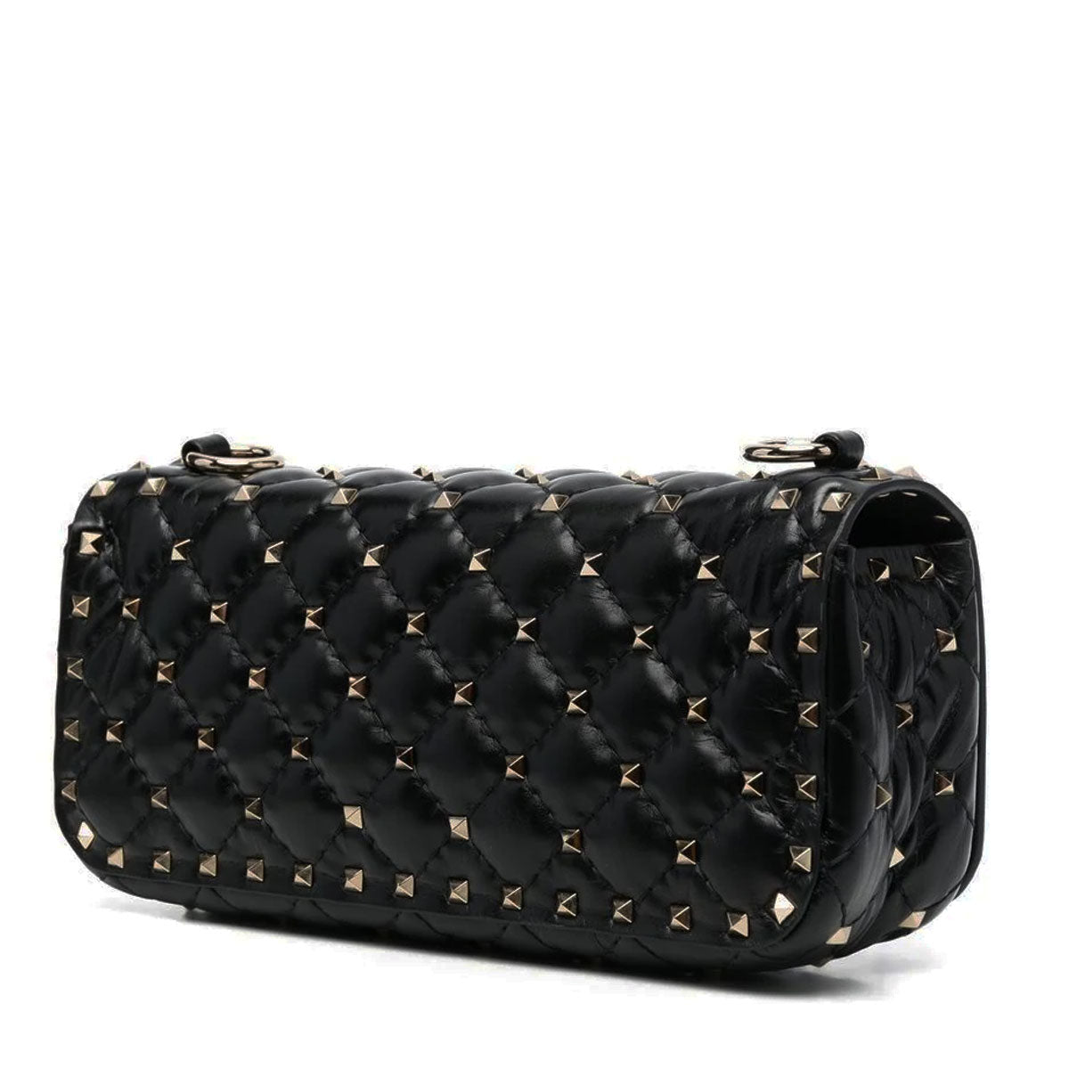 Valentino Garavani Rockstud Spike shoulder bag with chain in calfskin. Diamond quilted pattern embellished with signature pale gold-tone micro studs and enhanced by tone-on-tone stitching. Equipped with an ajustable leather shoulder strap and handle/chain, both removable. This bag can be worn over the shoulder, cross body or clutched in the hand. Flap with twist lock closure. Suede lining with one interior slip pocket.