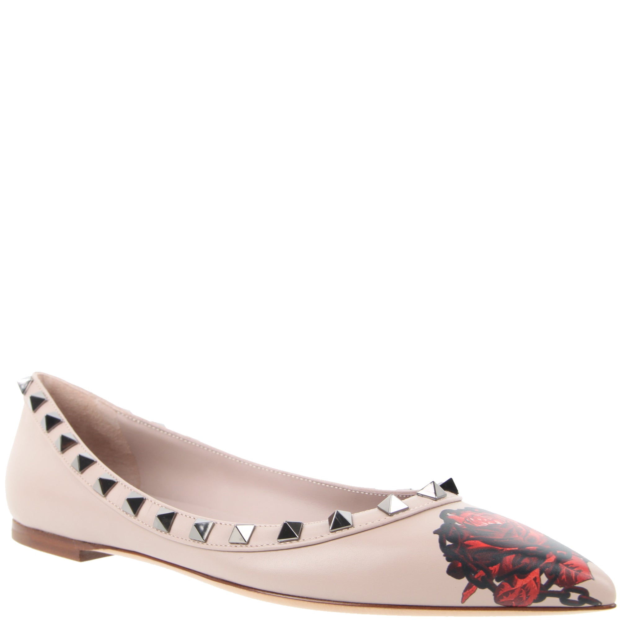 Poetic rose imagery designed in collaboration with Jun Takahashi of Undercover adorns the pointy-toe of an iconic ballerina edged with signature pyramid studs. Valentino Garavani Rockstud ballerina in calfskin leather and nappa trim, noir-finish studs.