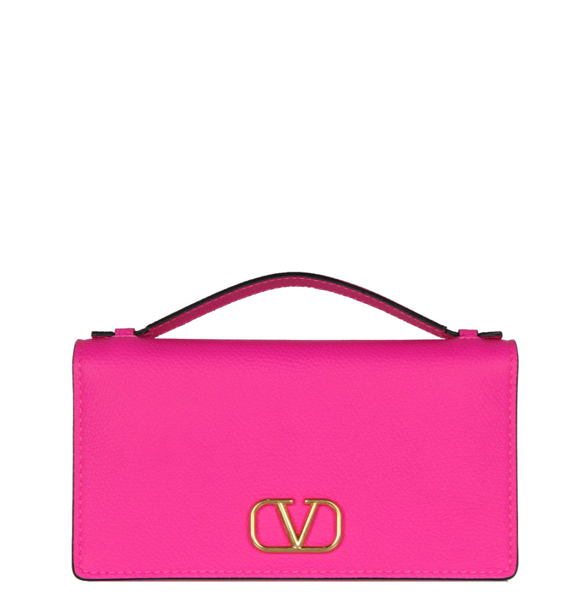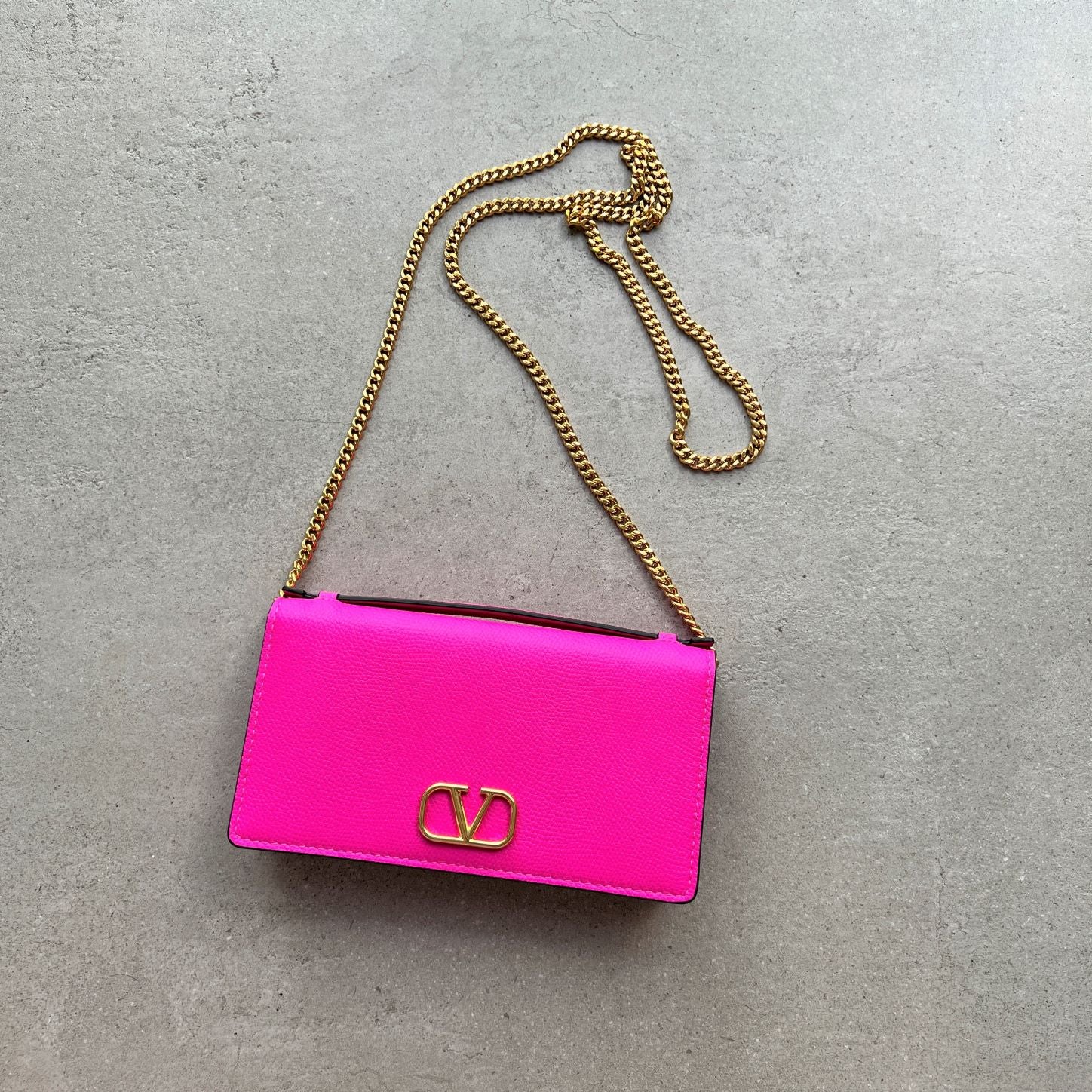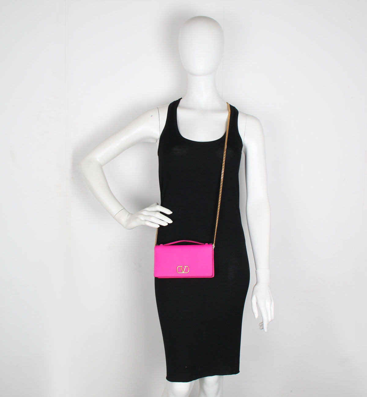 Valentino Garavani VLogo Signature grainy calfskin wallet with chain strap. One main compartment with eight card slots and lateral pocket with zip. Antique brass finish logo and hardware, leather handle and removable chain. Front foldover flap pocket with magnetic snap closure.