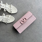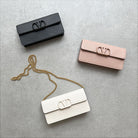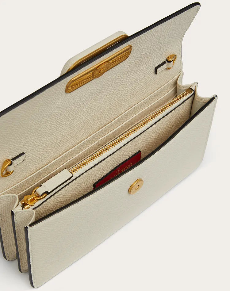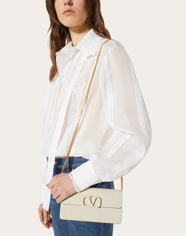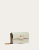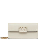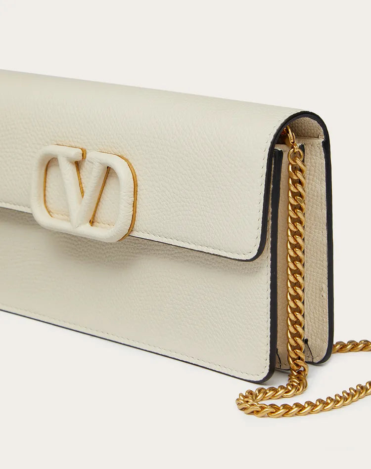 Valentino Garavani VSling wallet on chain in calfskin leather embellished with leather covered logo detail and snap button closure. This bag features eight card slots and one flat pocket. It has two main compartments divided by a zippered pocket. It comes with a detachable chain strap for cross body or shoulder bag wear.