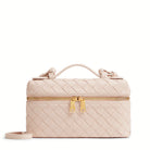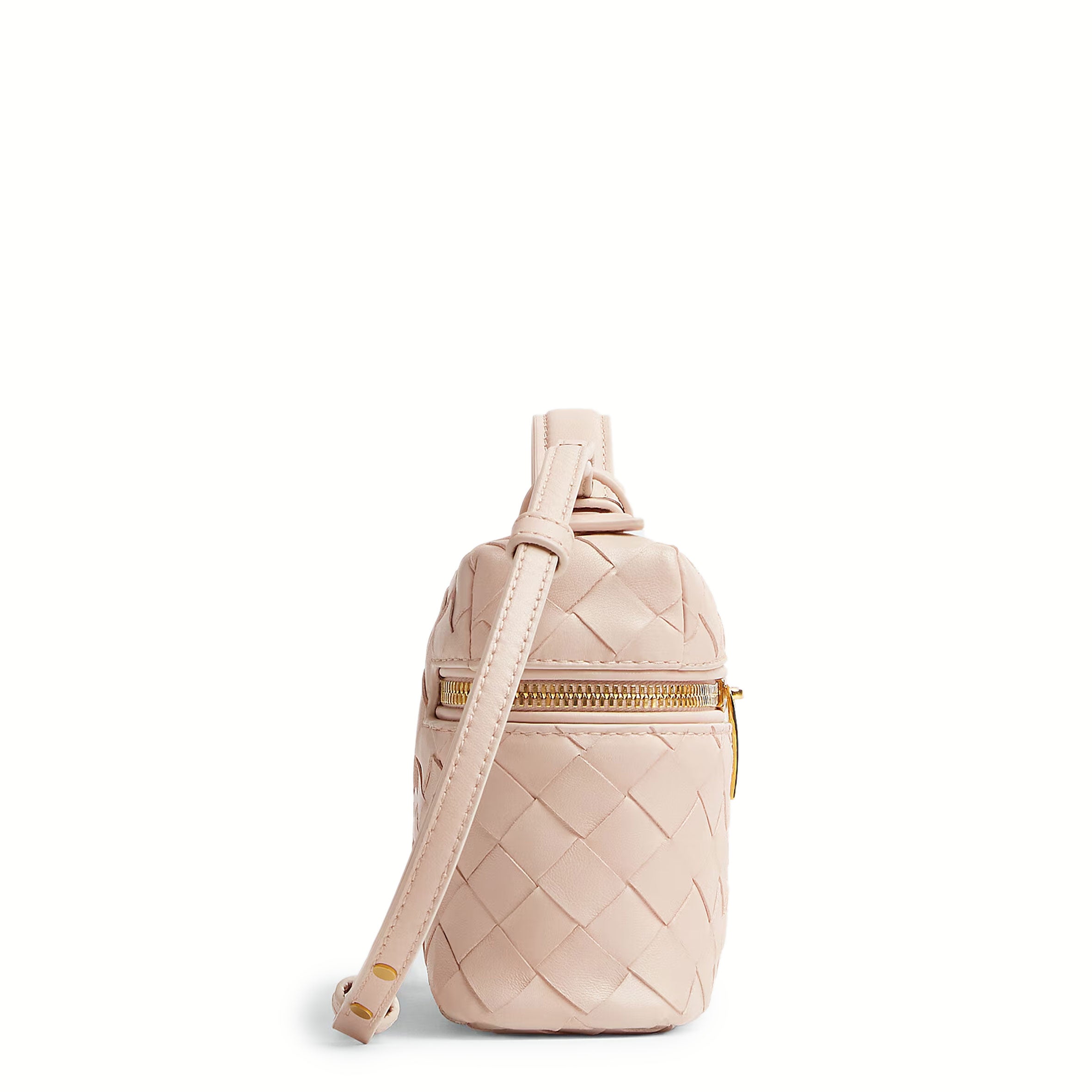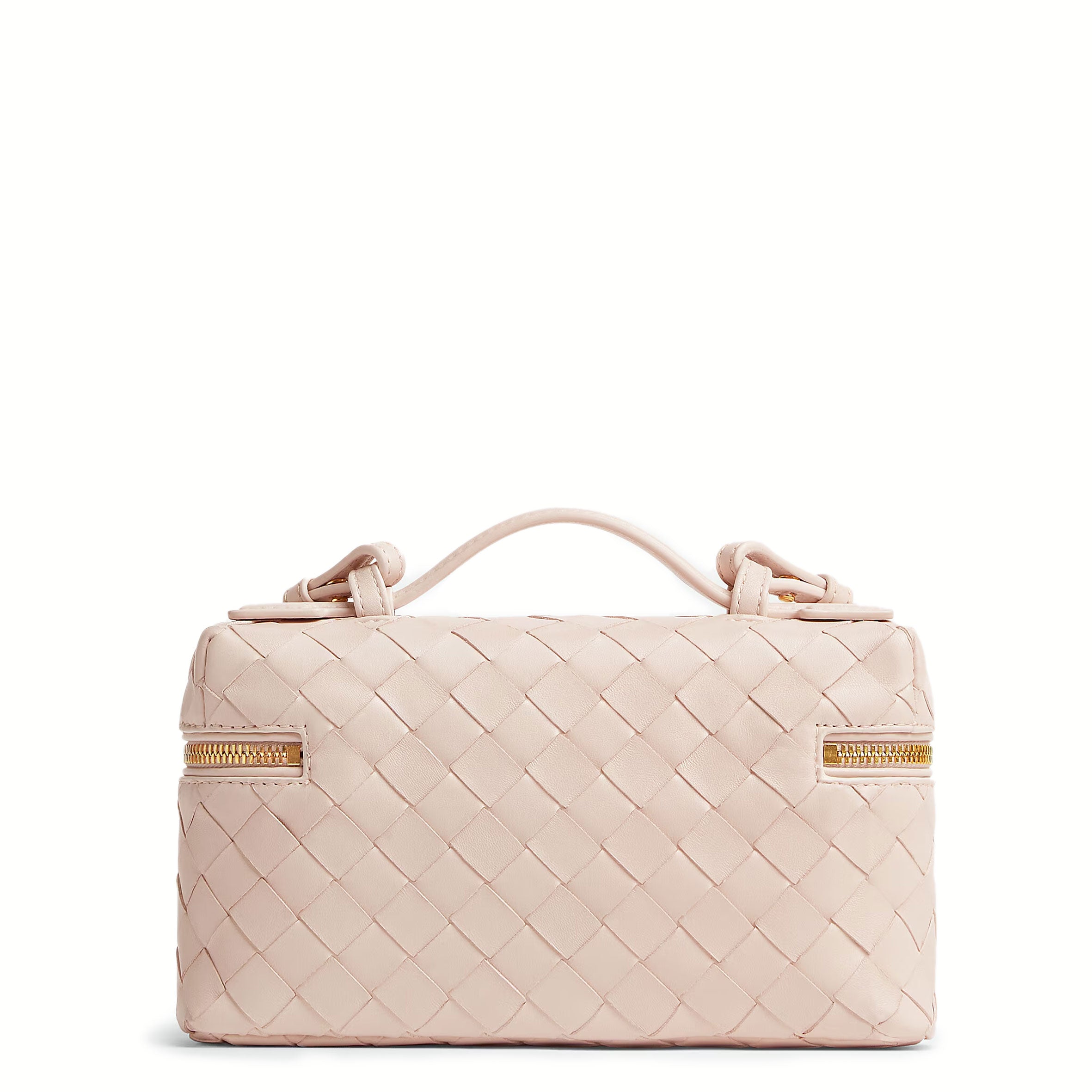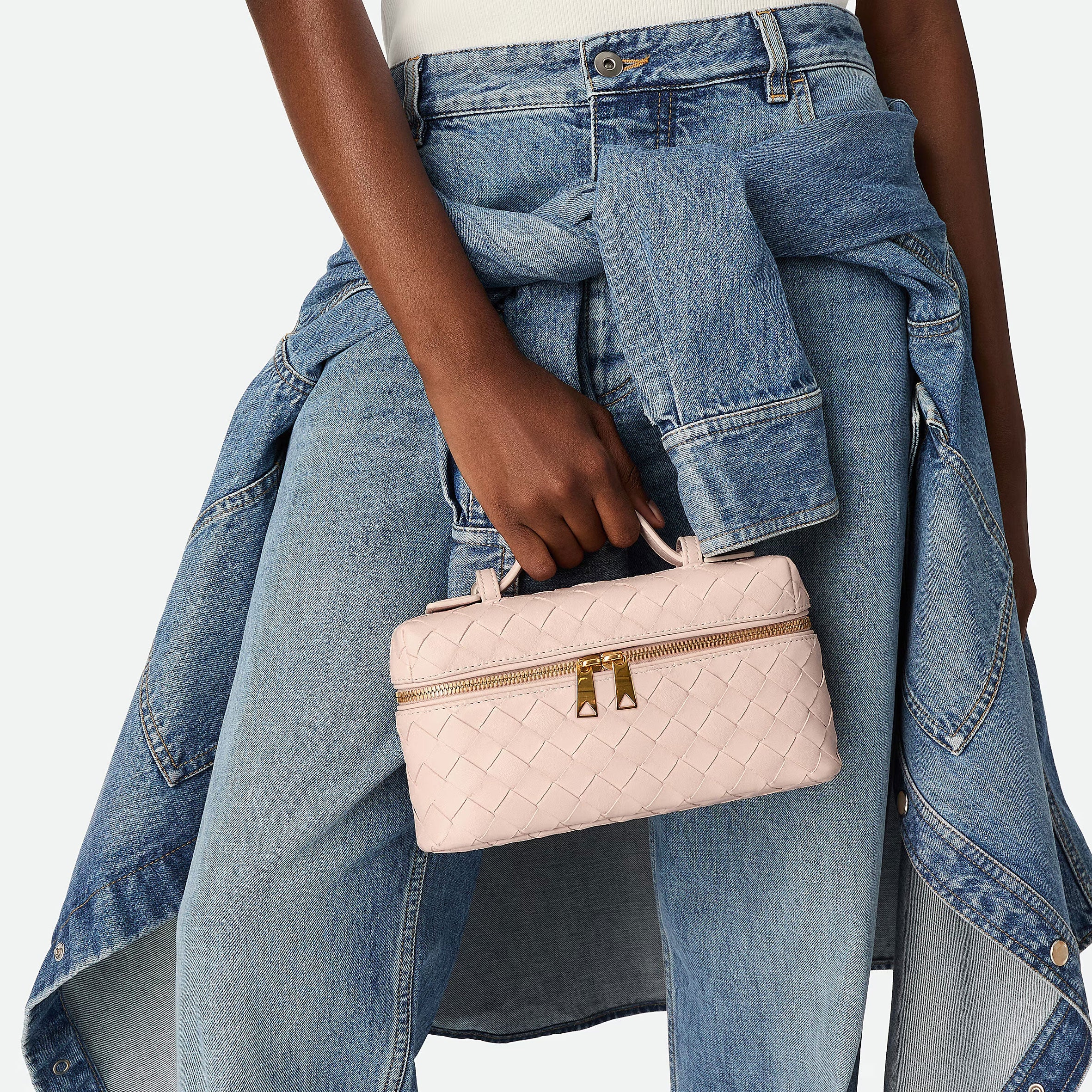 Bottega Veneta vanity case in intrecciato leather with top handle and removable, adjustable crossbody strap. Can be worn as a top handle or shoulder or crossbody bag.