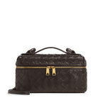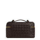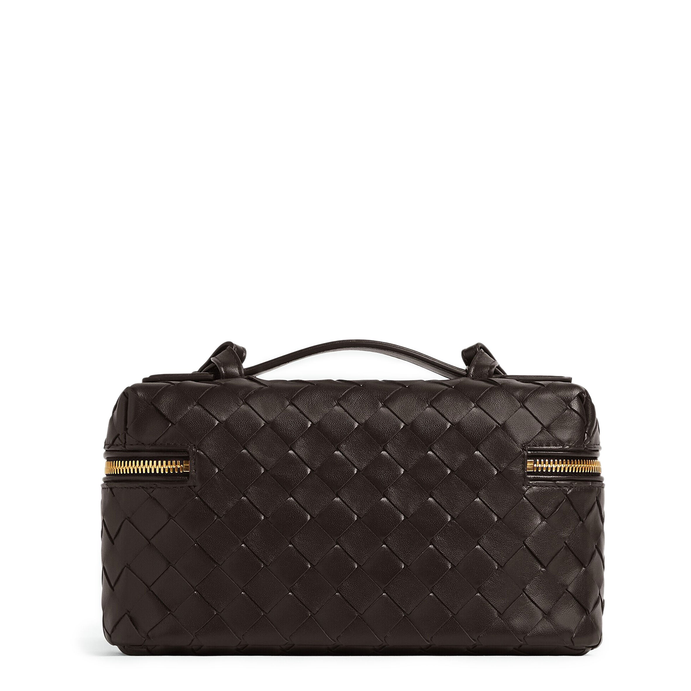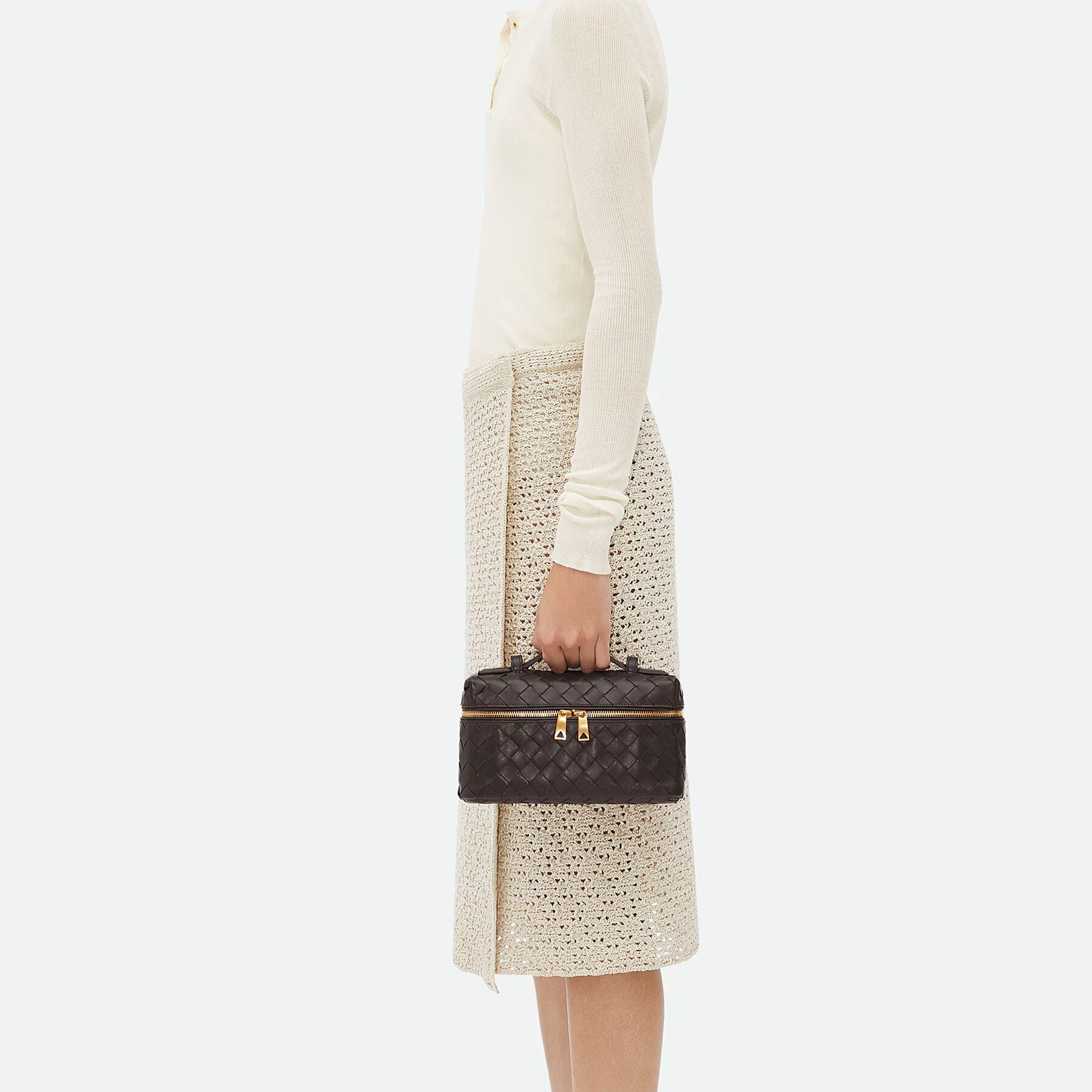 Bottega Veneta vanity case in intrecciato leather with top handle and removable, adjustable crossbody strap. Can be worn as a top handle or shoulder or crossbody bag.