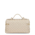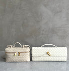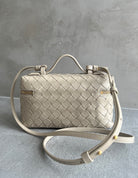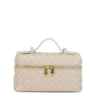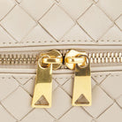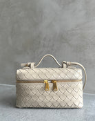 Bottega Veneta vanity case in intrecciato leather with top handle and removable, adjustable crossbody strap. Can be worn as a top handle or shoulder or crossbody bag.