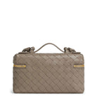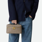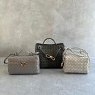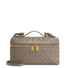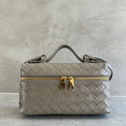 Bottega Veneta vanity case in intrecciato leather with top handle and removable, adjustable crossbody strap. Can be worn as a top handle or shoulder or crossbody bag.