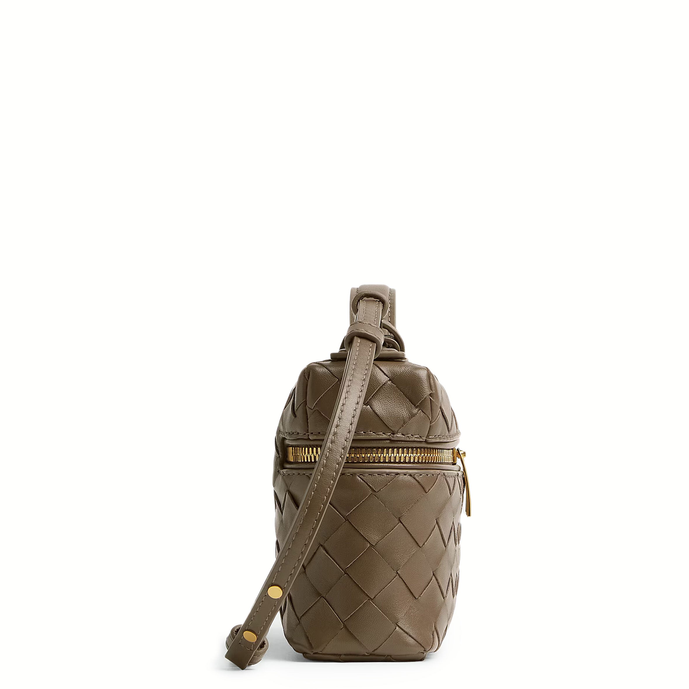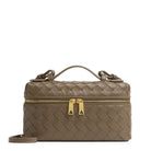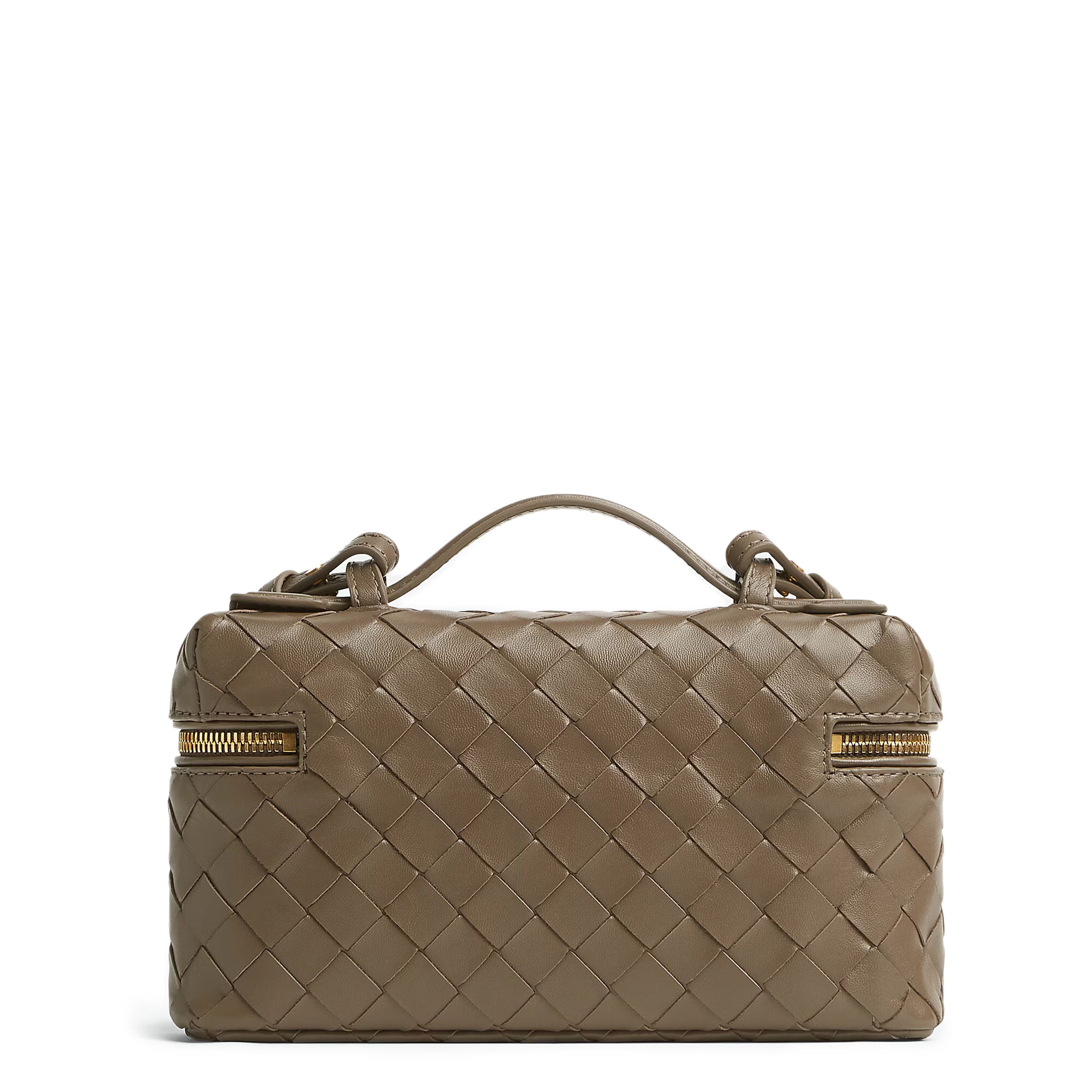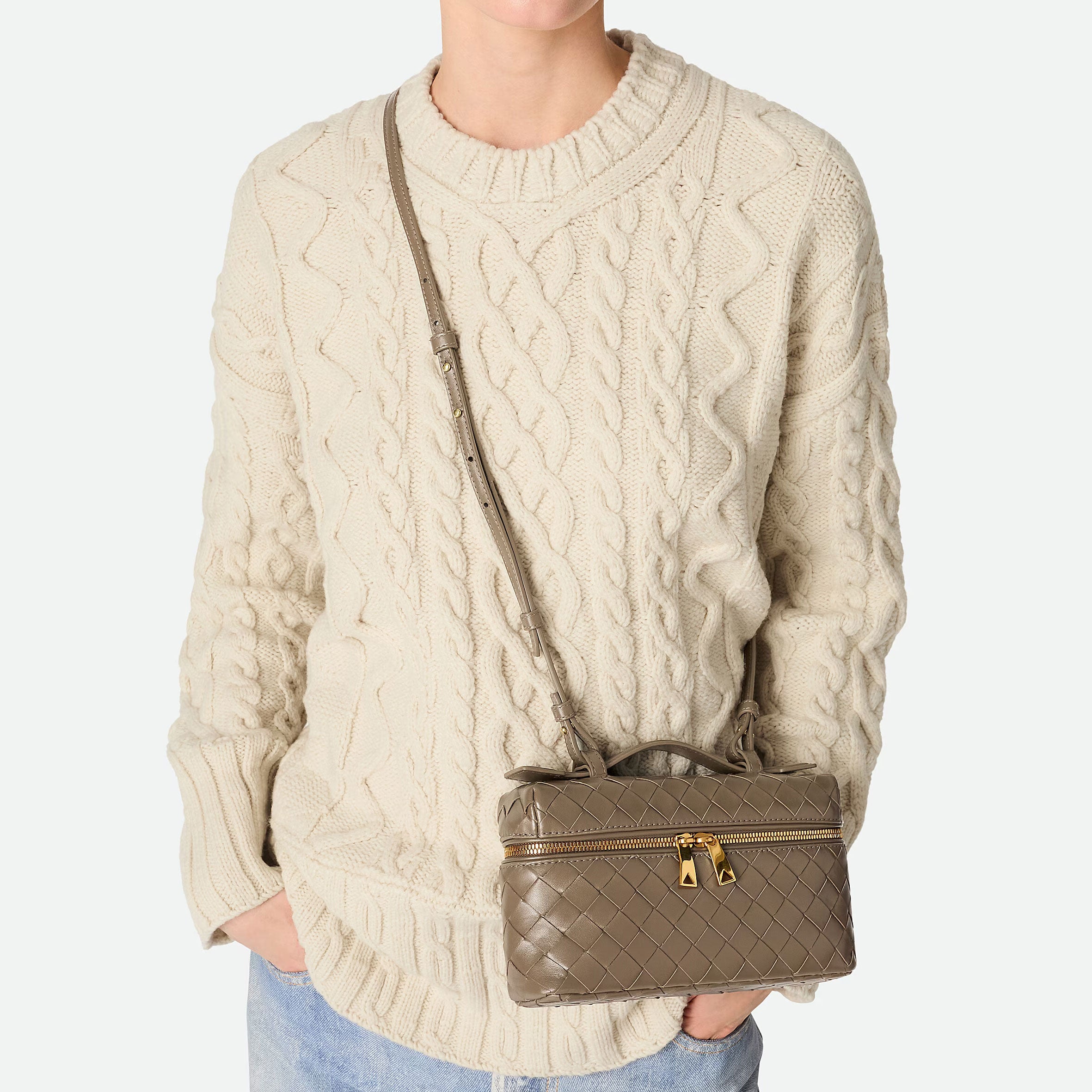 Bottega Veneta vanity case in intrecciato leather with top handle and removable, adjustable crossbody strap. Can be worn as a top handle or shoulder or crossbody bag.