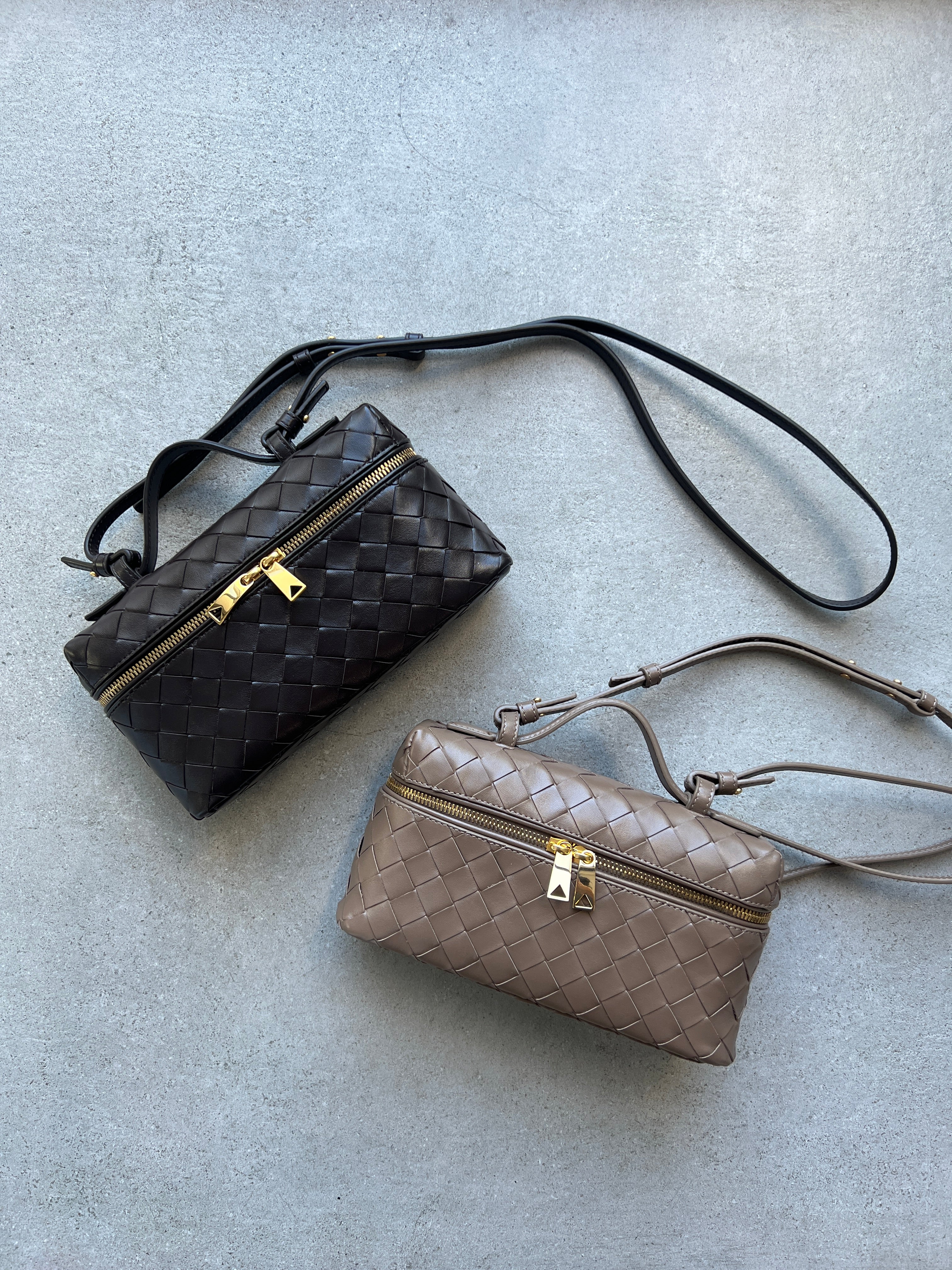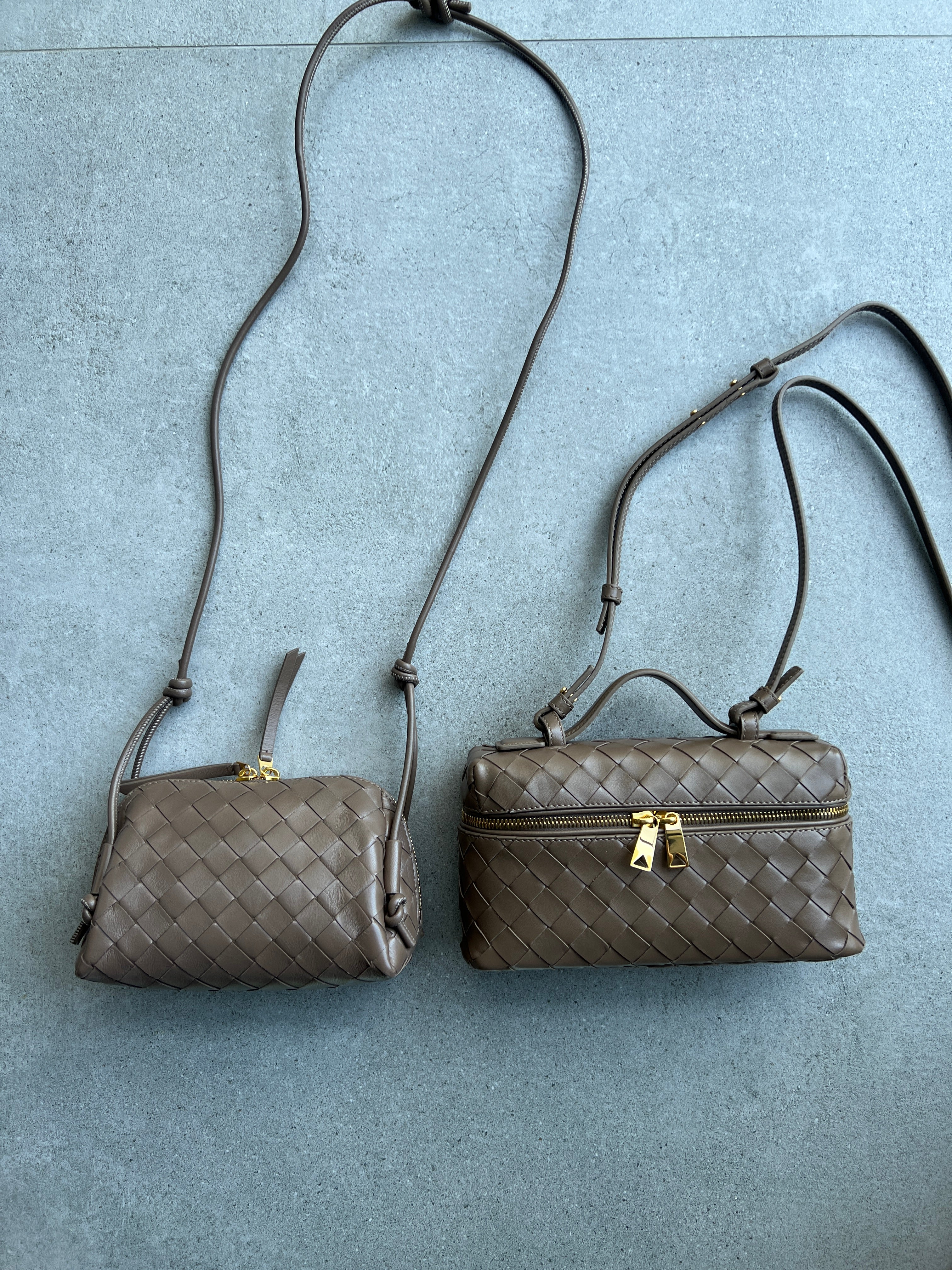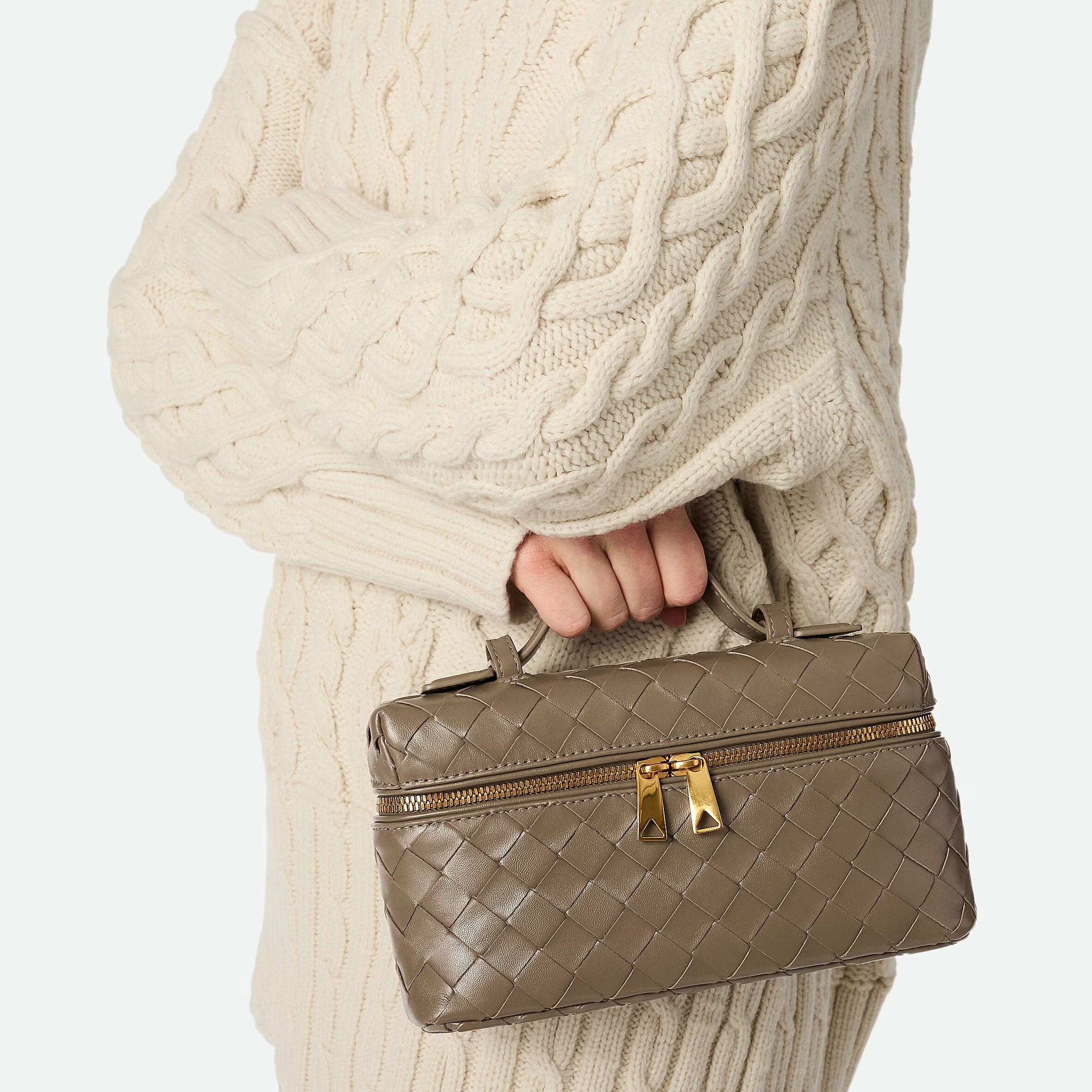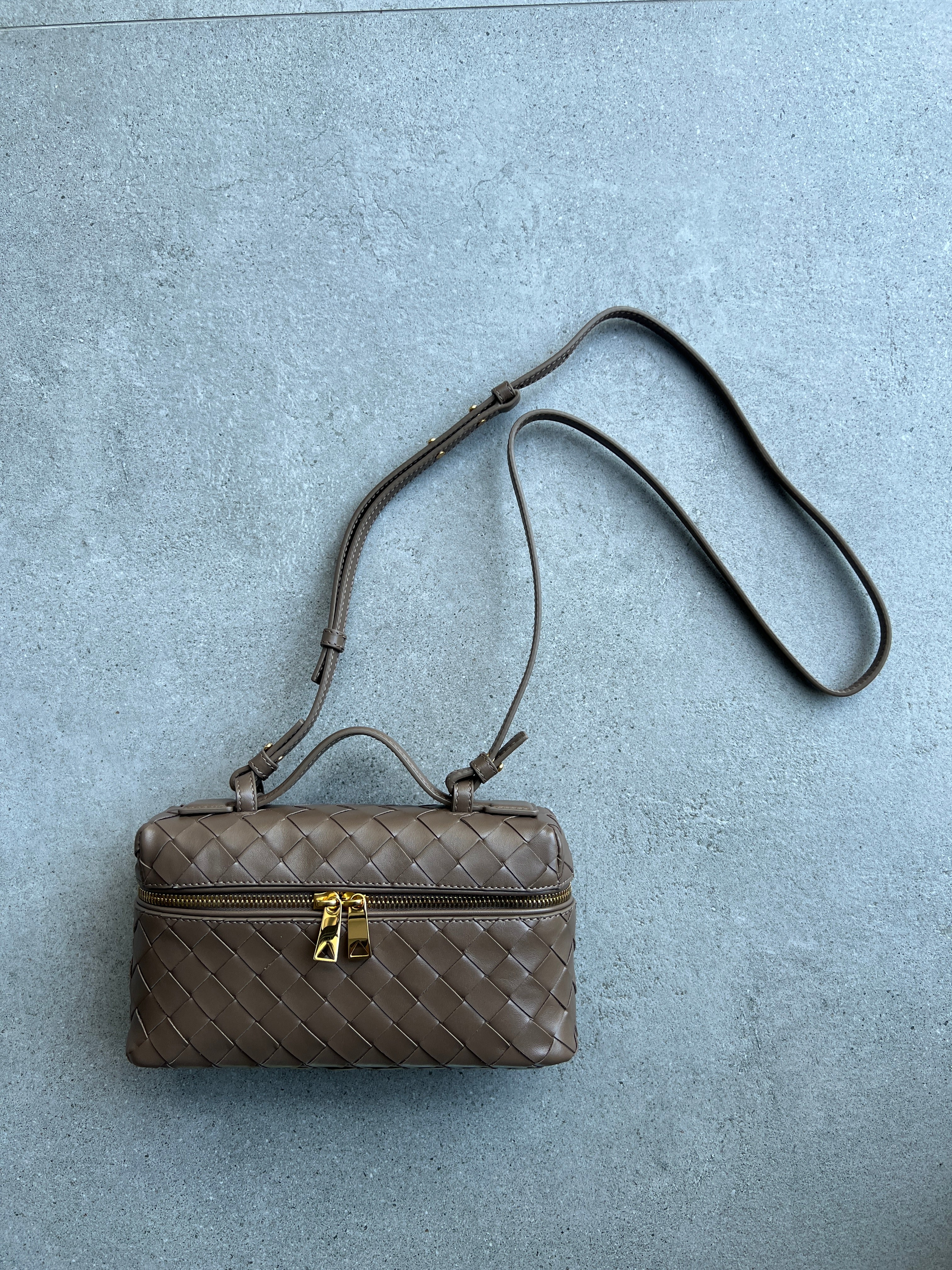 Bottega Veneta vanity case in intrecciato leather with top handle and removable, adjustable crossbody strap. Can be worn as a top handle or shoulder or crossbody bag.