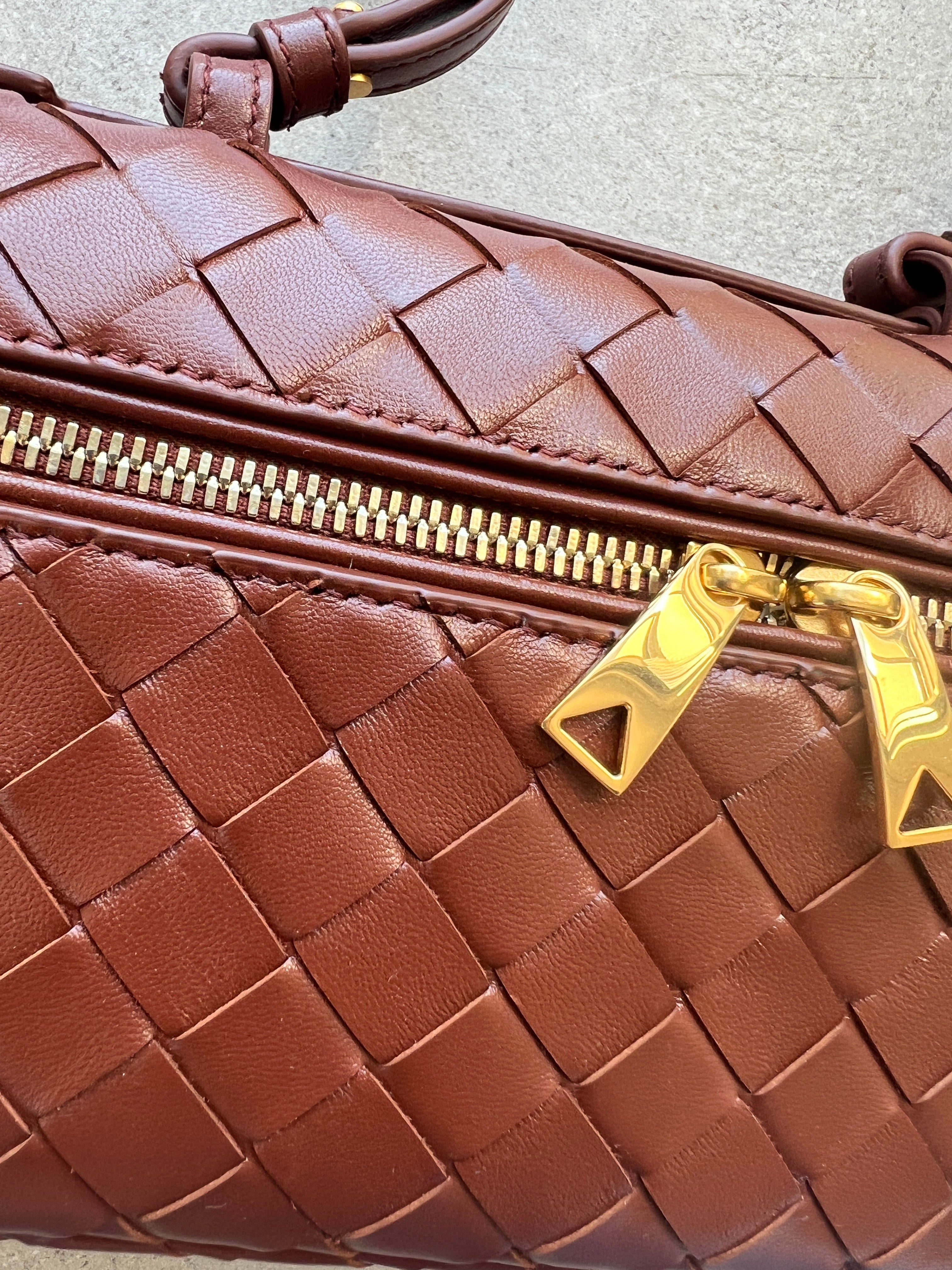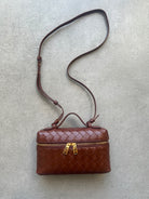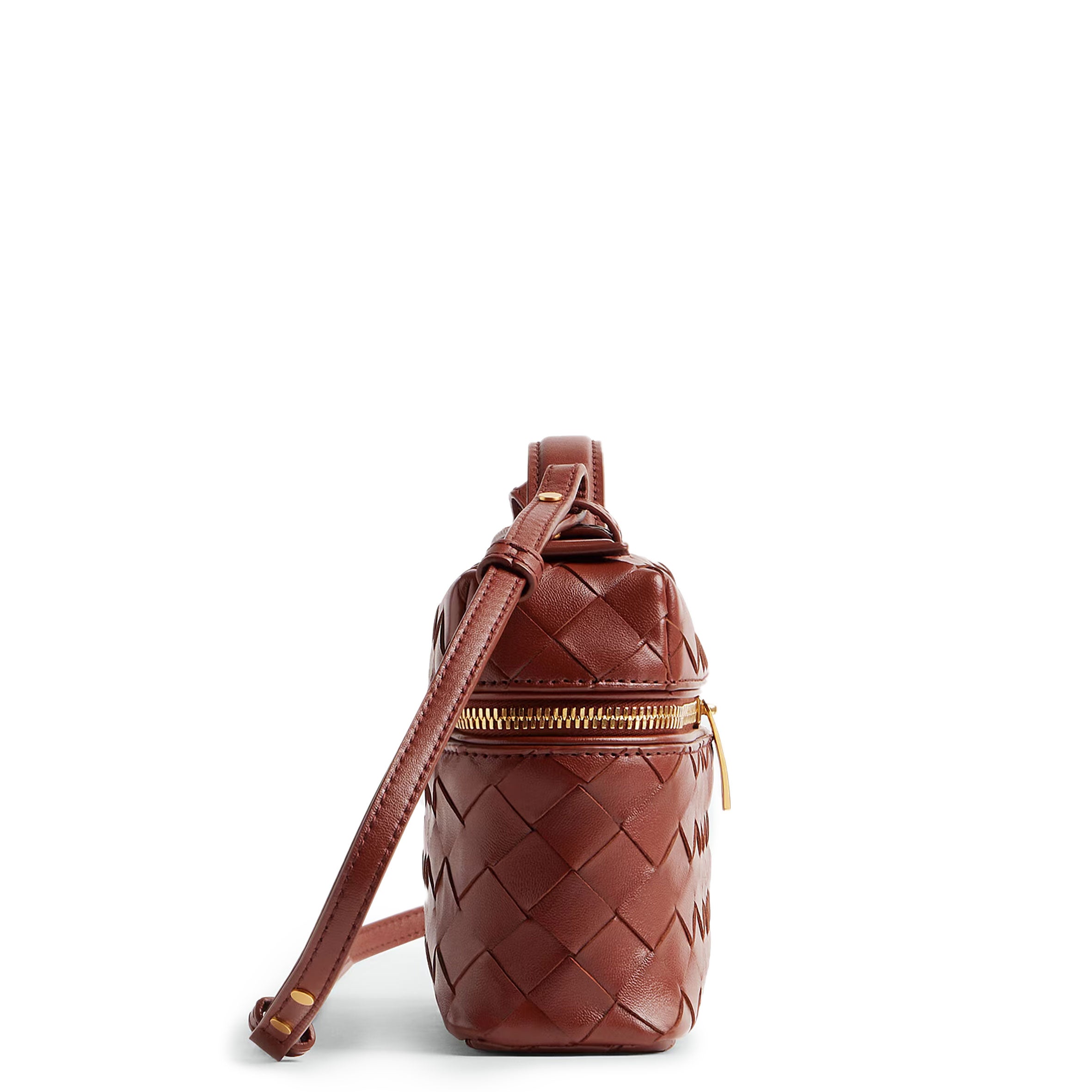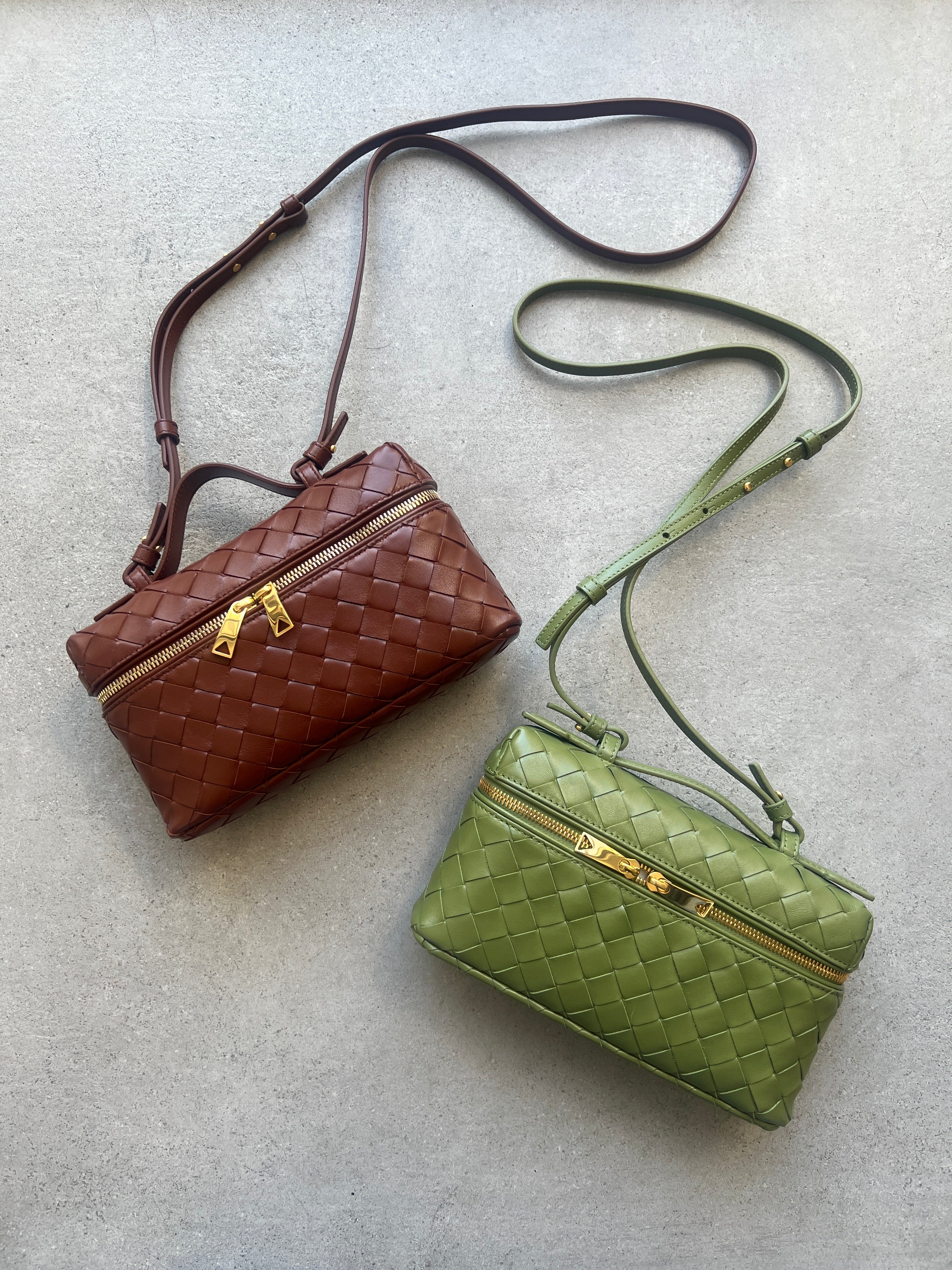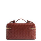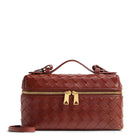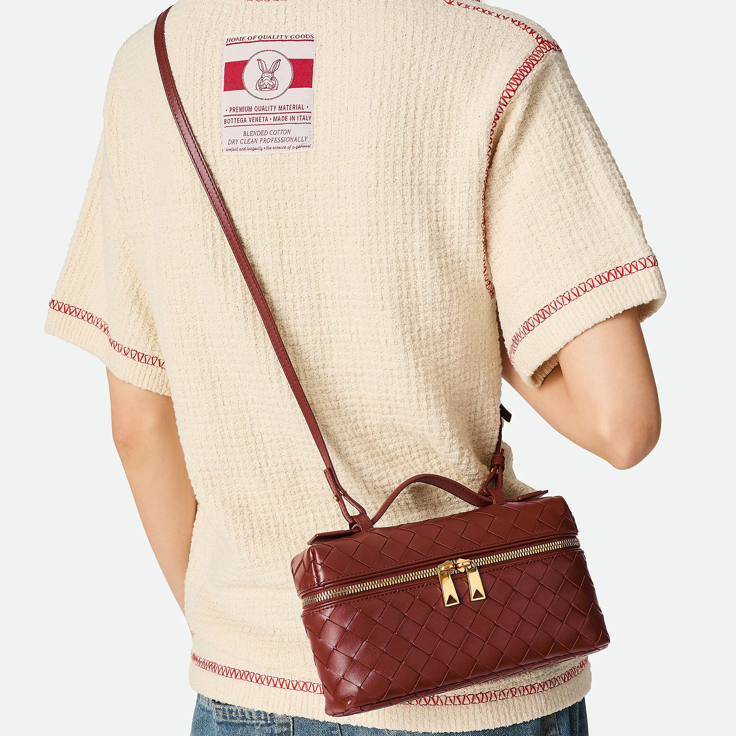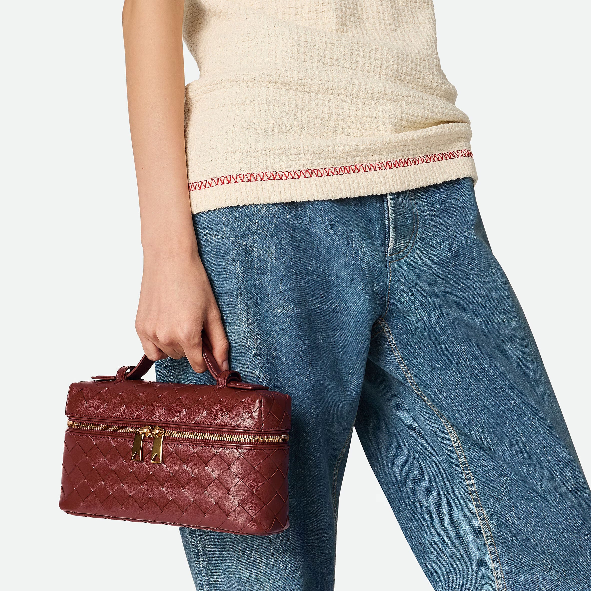 Bottega Veneta vanity case in intrecciato leather with top handle and removable, adjustable crossbody strap. Can be worn as a top handle or shoulder or crossbody bag.