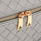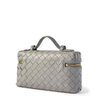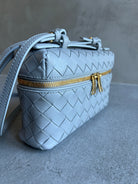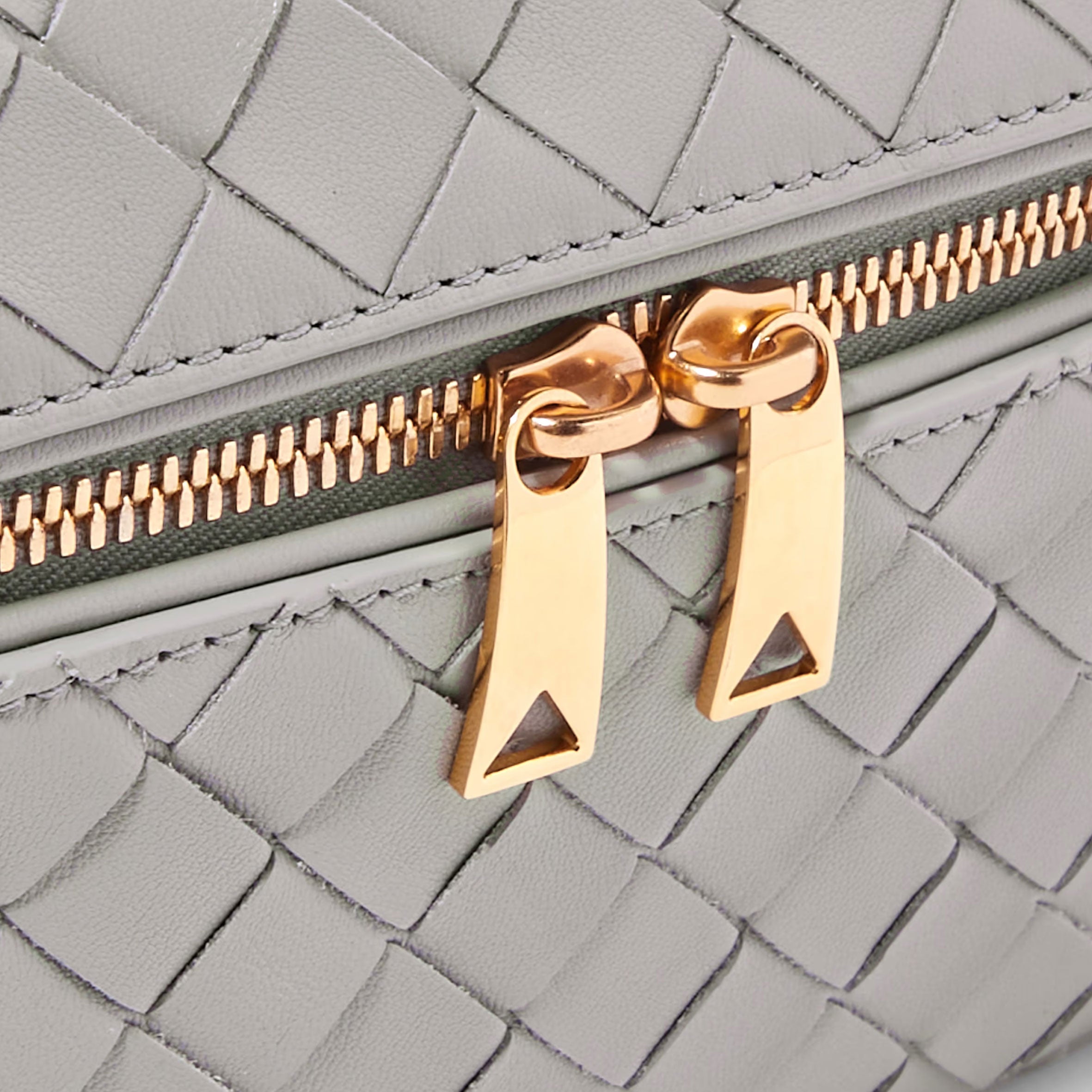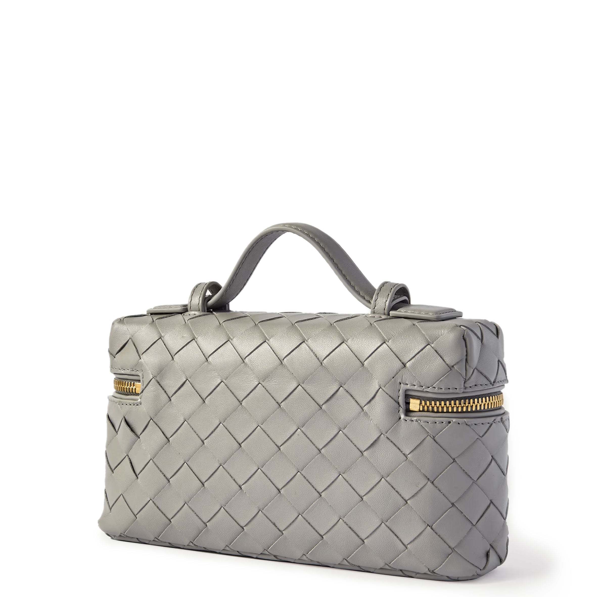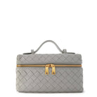 Bottega Veneta vanity case in intrecciato leather with top handle and removable, adjustable crossbody strap. Can be worn as a top handle or shoulder or crossbody bag.