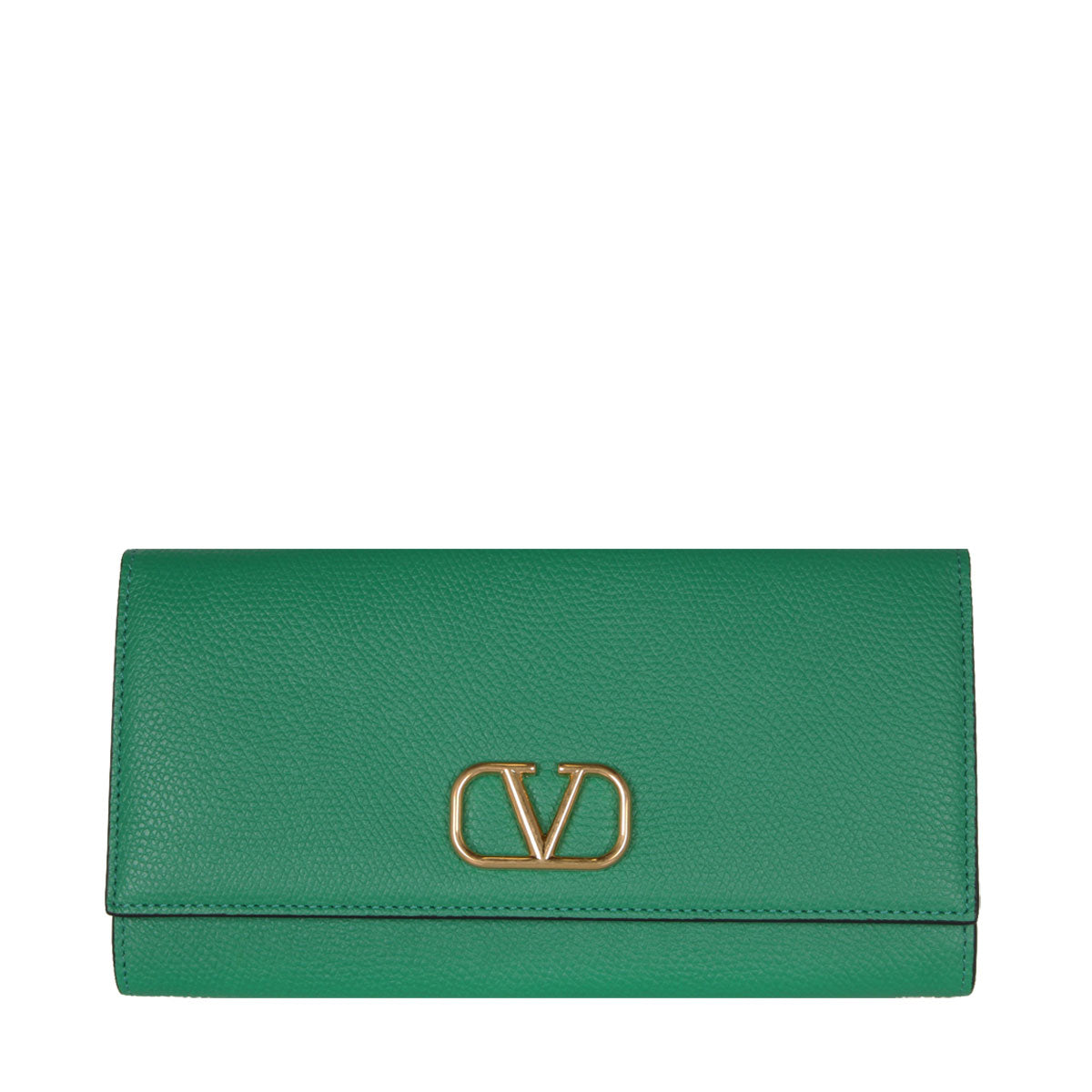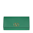 Valentino medium Flap Continental Wallet with signature Vlogo hardware detailing in antique gold tone. Features grained leather with 14 card slots, one note slot and zip coin pouch with canvas lining. Patch pocket at back face and press stud closure.