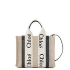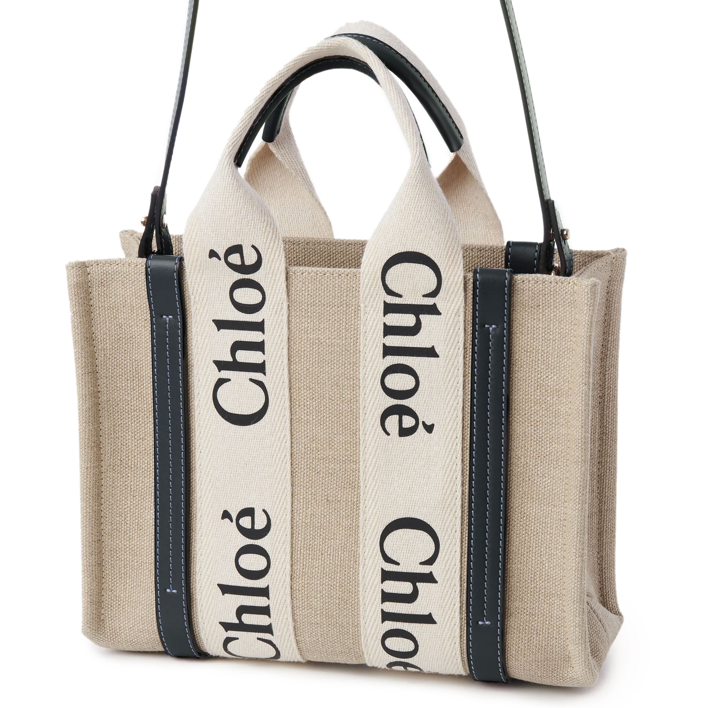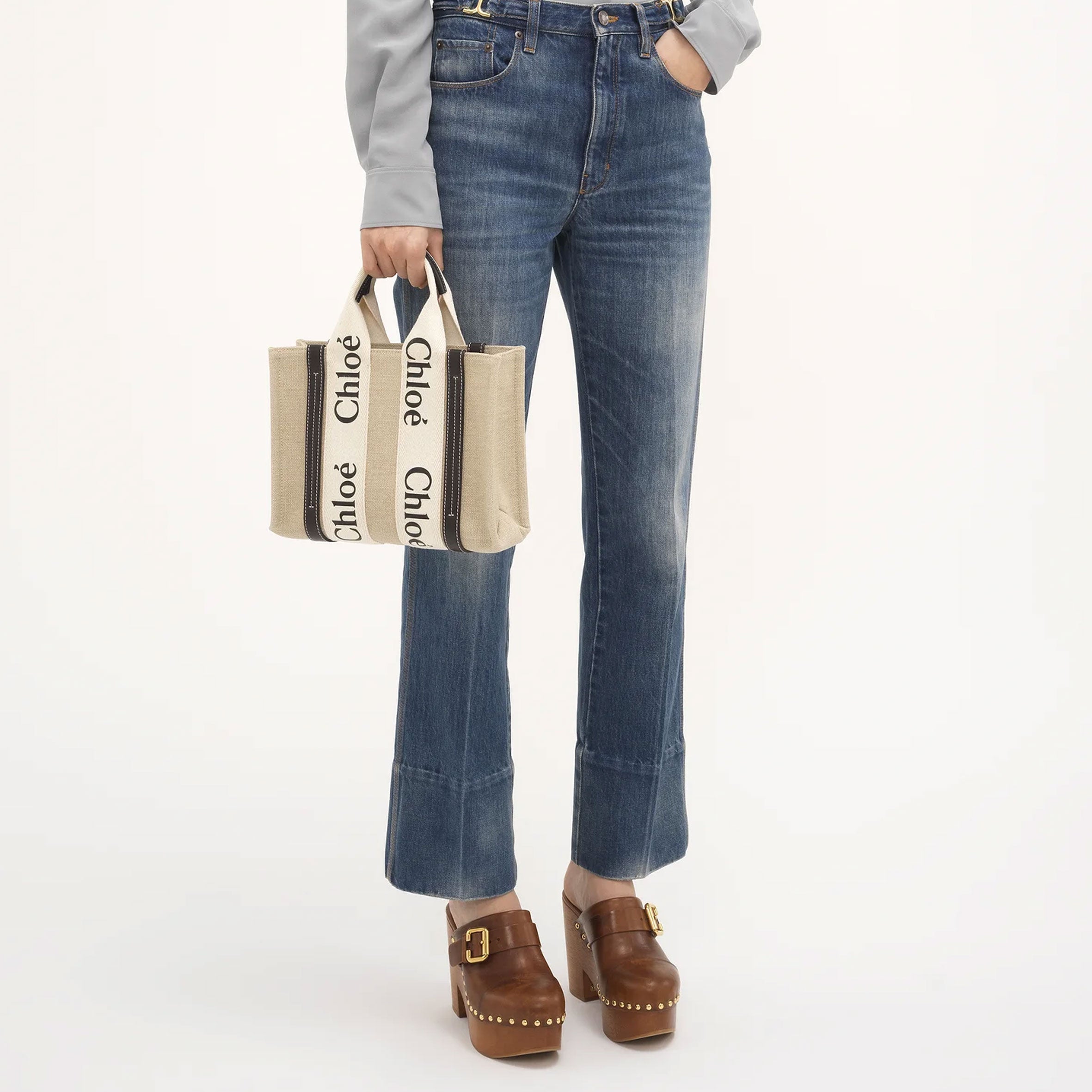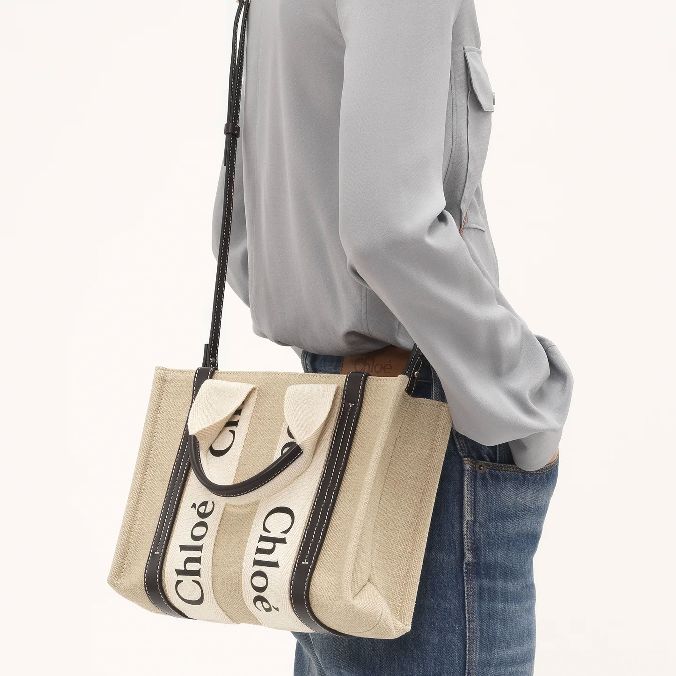 Crafted from Linen canvas detailed with shiny calfskin strips, this small Woody tote bag is a compact bag with a long, removable strap and a strong summer attitude. The roomy inside compartment includes a practical flat pocket.