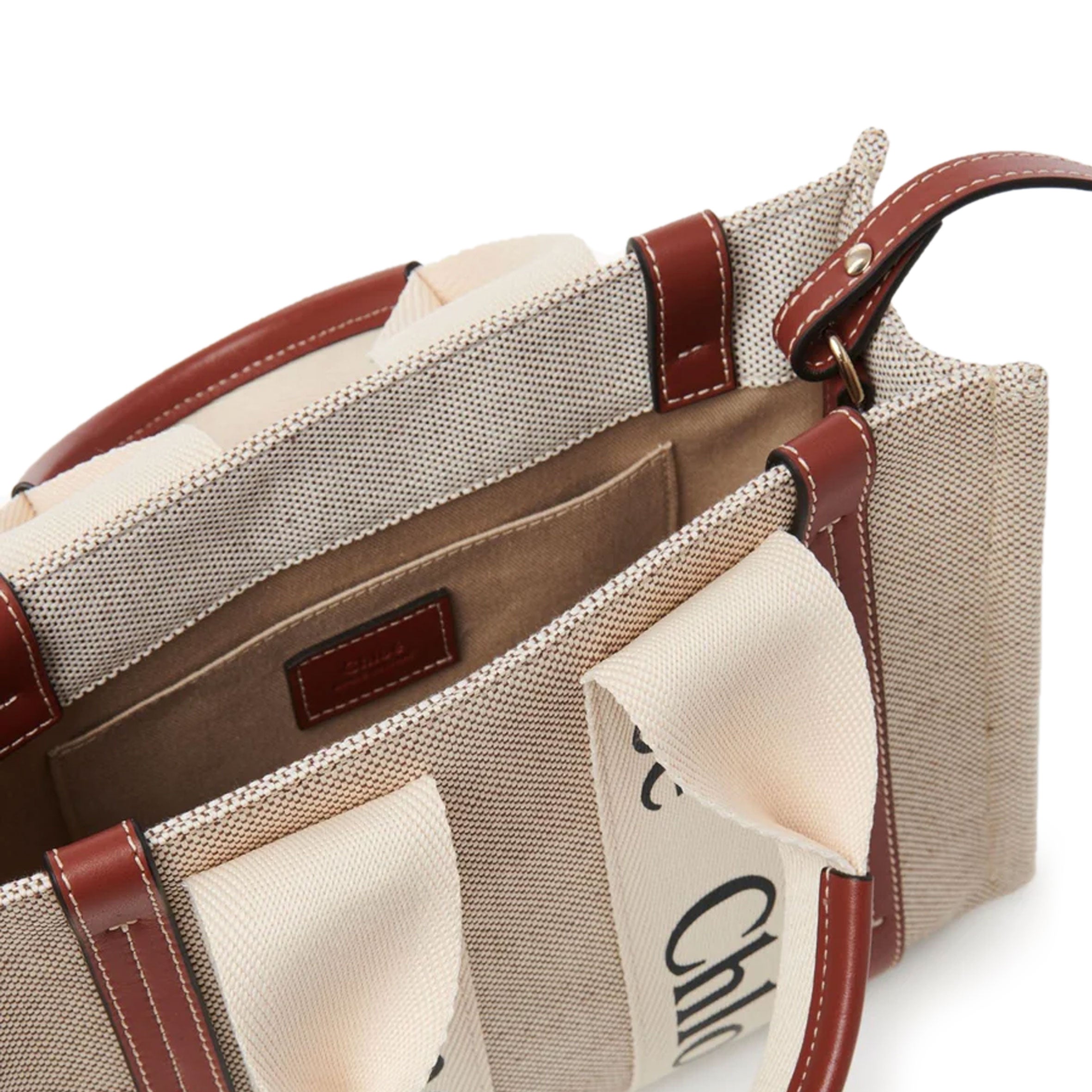 Crafted from linen canvas detailed with shiny calfskin strips, this medium Woody tote bag is a spacious day-to-evening bag with a strong summer attitude. The roomy inside compartment includes a practical flat pocket.