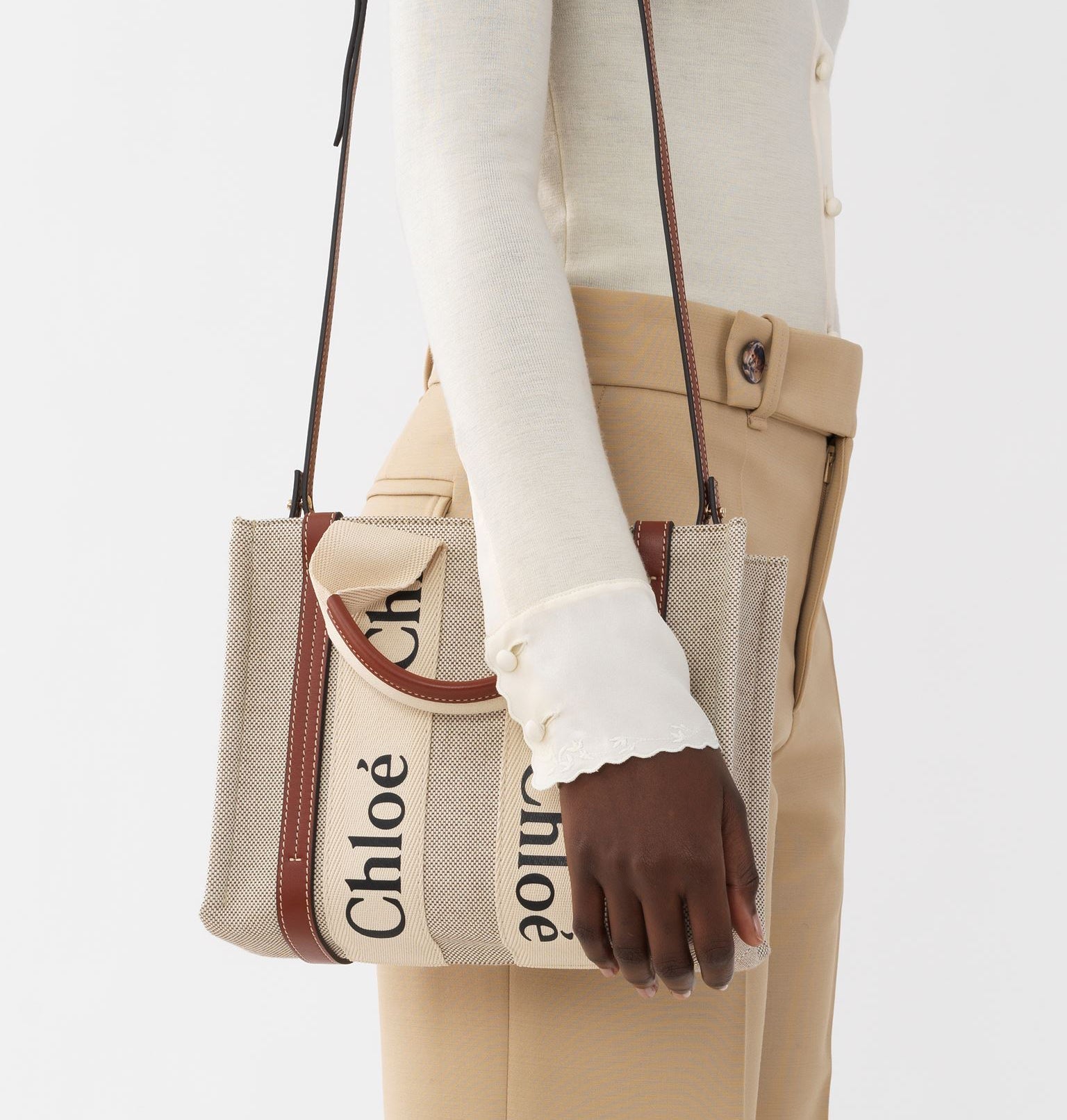 The bag's sharp, modern lines are emphasized by the contrasting vertical leather strips and the signature Chloé logo ribbon carried over from the Maison's Woody mule. Carry this tote bag comfortably on the shoulder