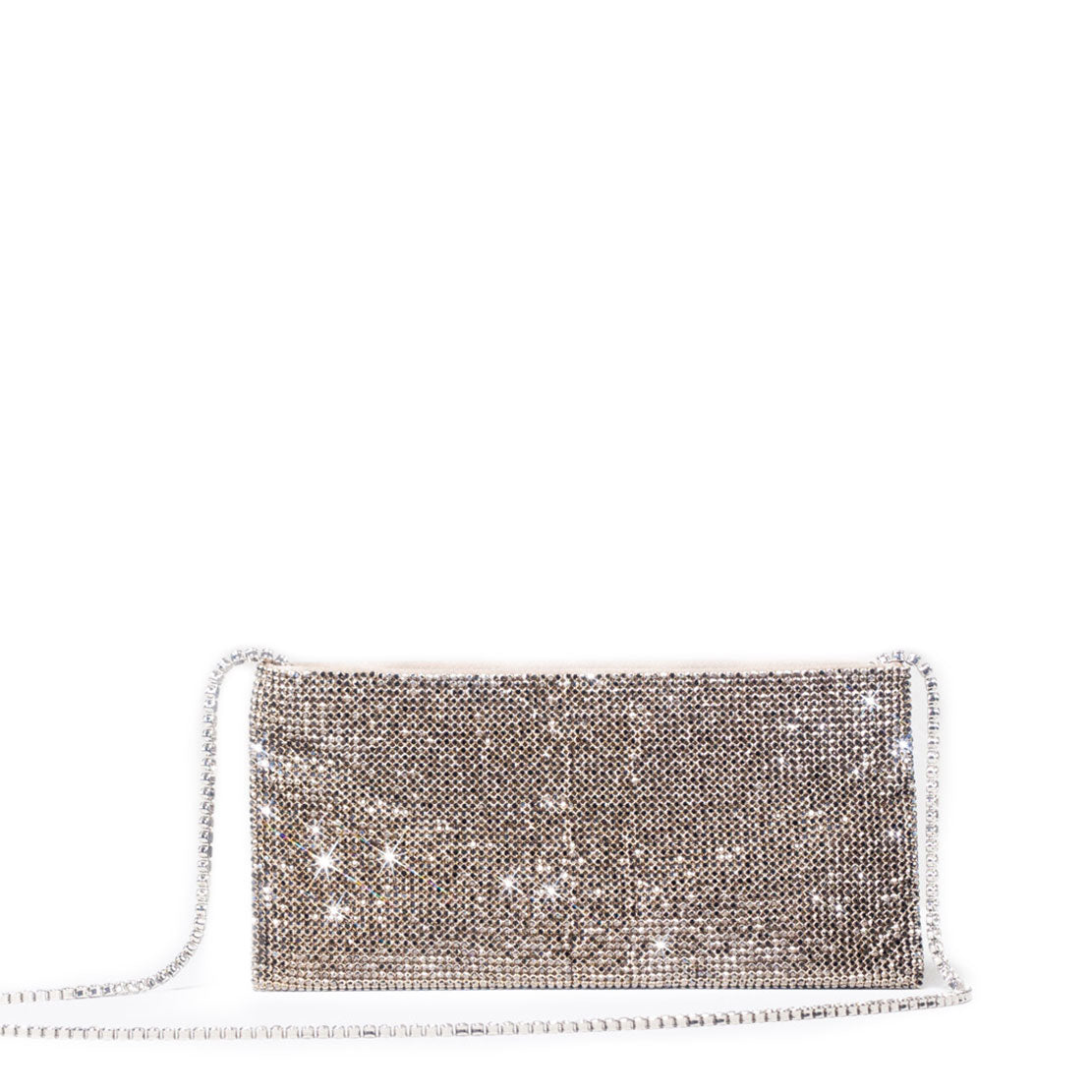 Designed to keep only what is really important, this bag is a mini clutch made with a soft net of crystals lined with denim, entirely hand-sewn. An elegant crystal shoulder strap allows you to wear it on the shoulder.