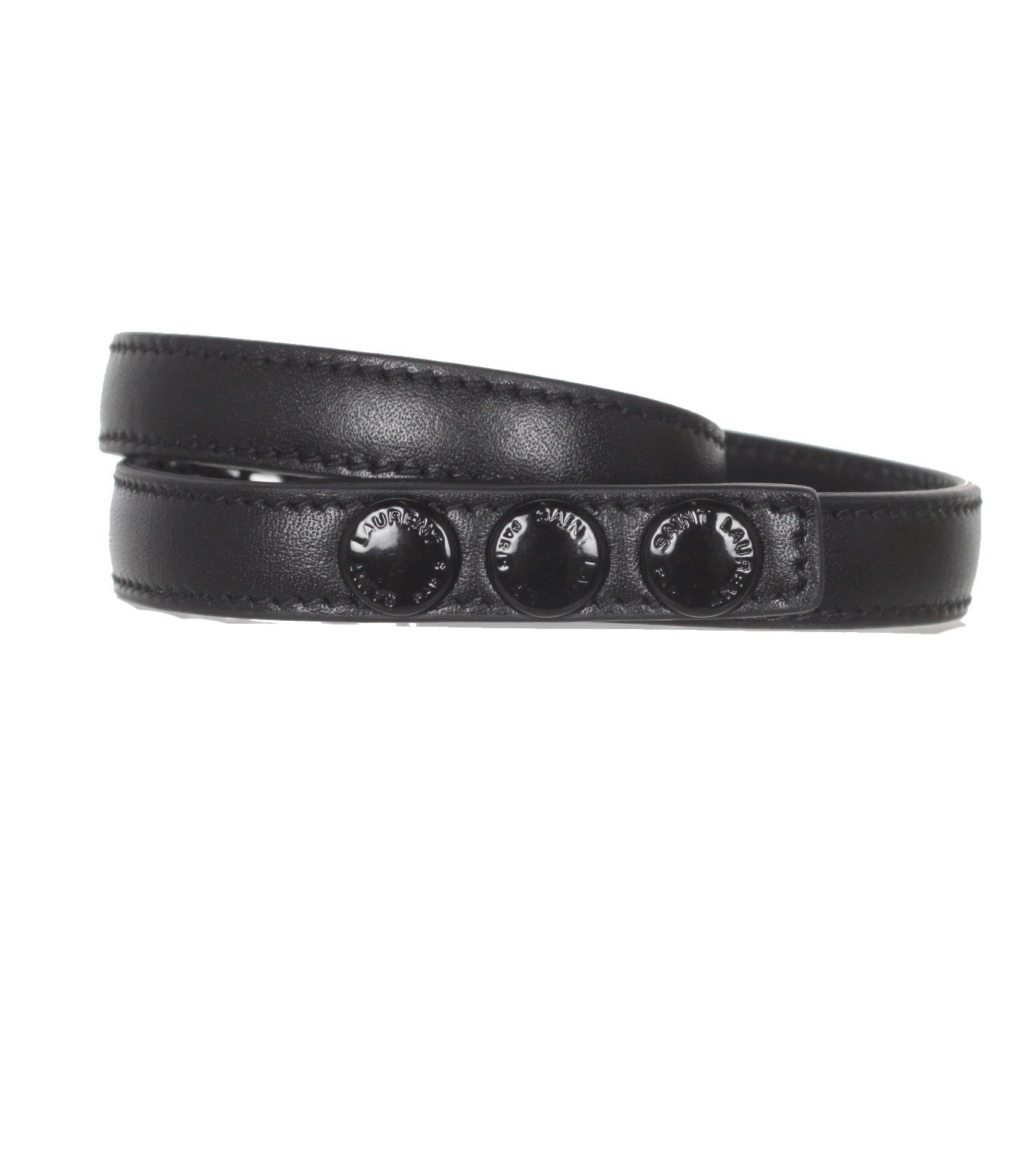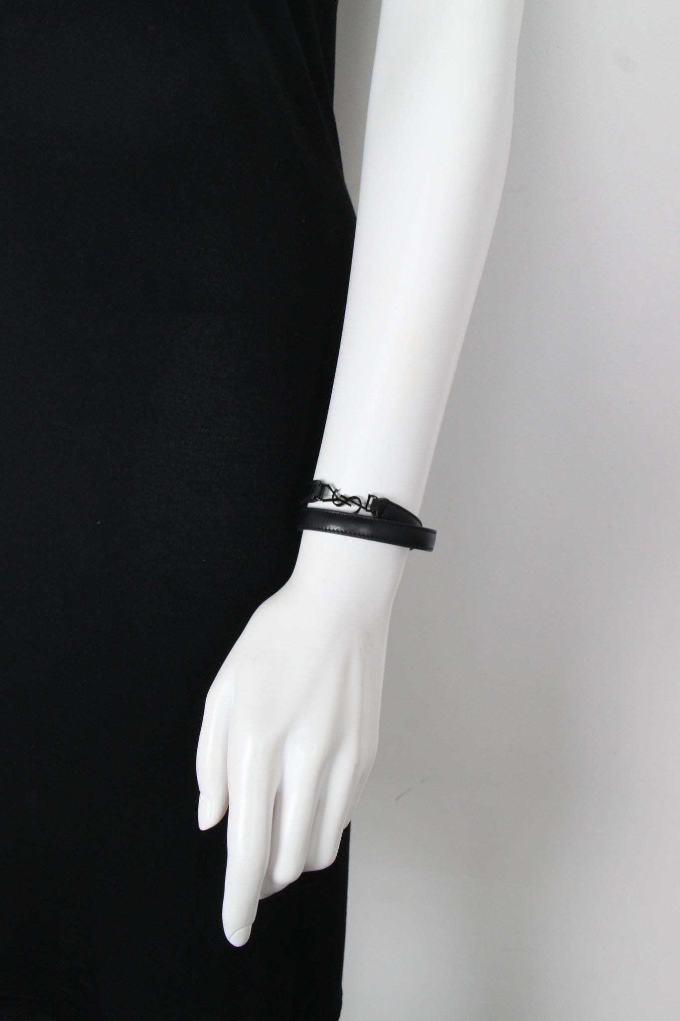 Saint Laurent double wrap around leather bracelet with YSL interlocking signature at centre in black, signature logo engraved underside, adjustable 2 snap closure.