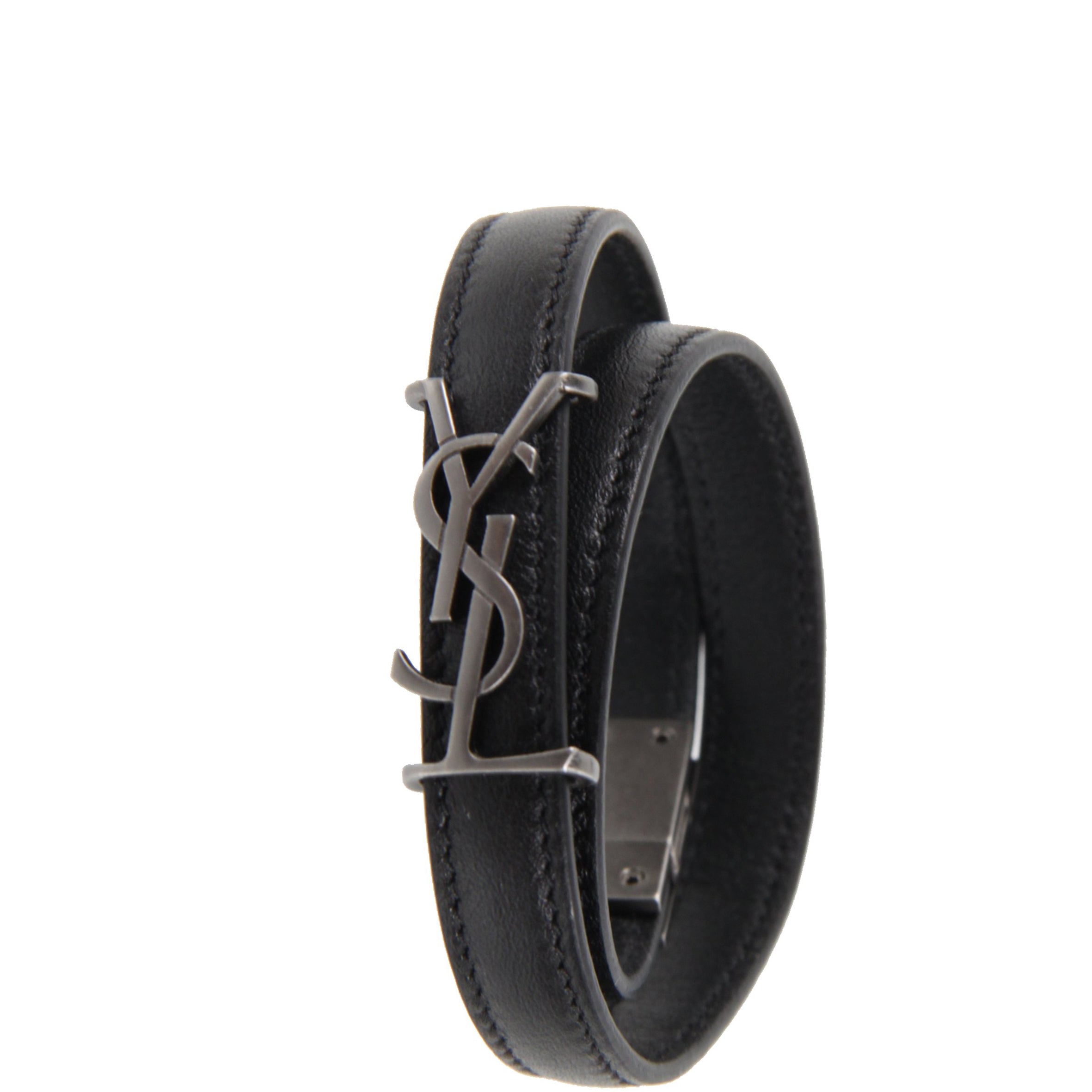 Saint Laurent double wrap around leather bracelet with YSL interlocking signature at centre with Saint Laurent engraved square clip clasp.