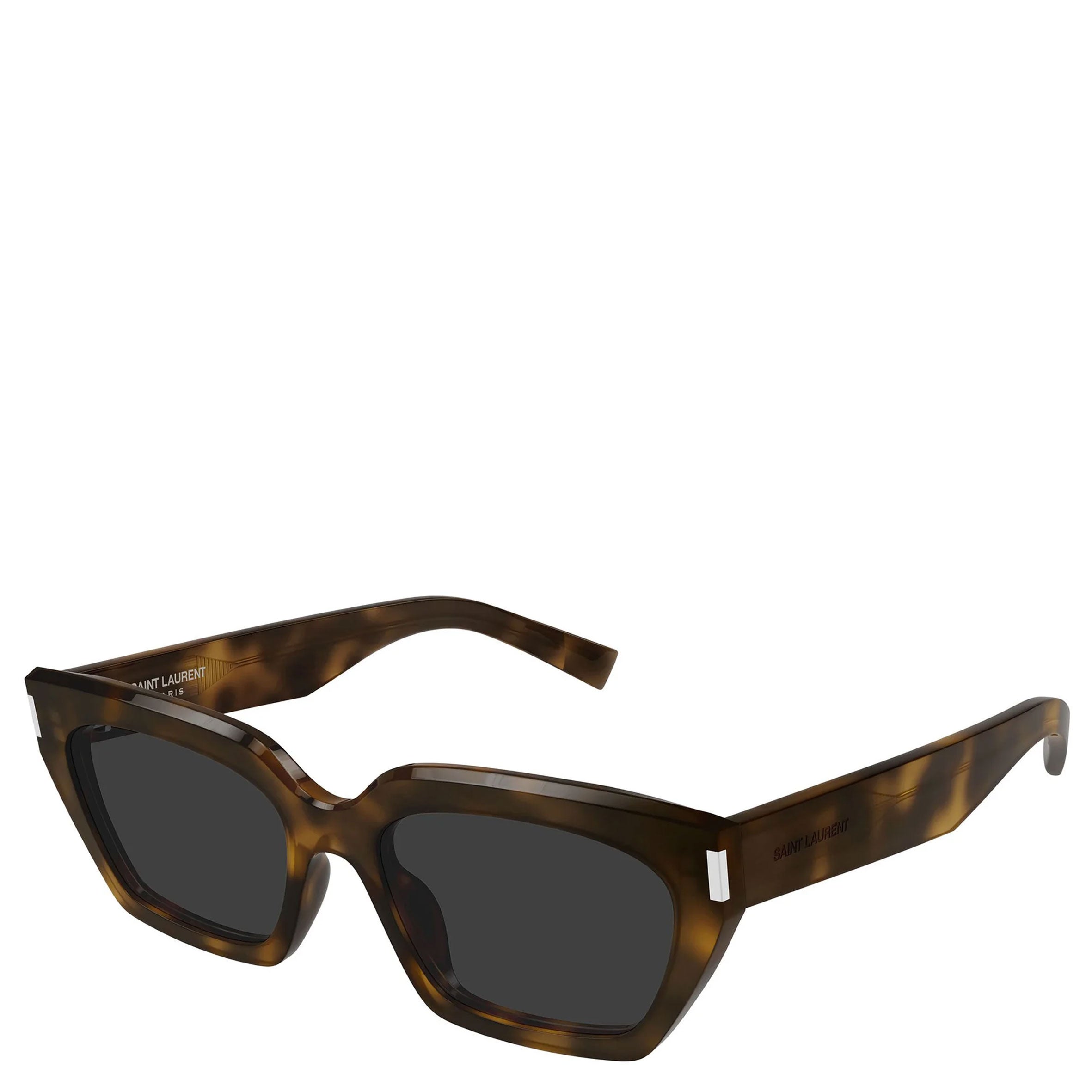 Saint Laurent SL 826 PAGE 002 sunglasses for women, featuring shiny medium havana cat eye recycled acetate frame and solid grey bio nylon lenses.