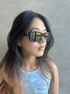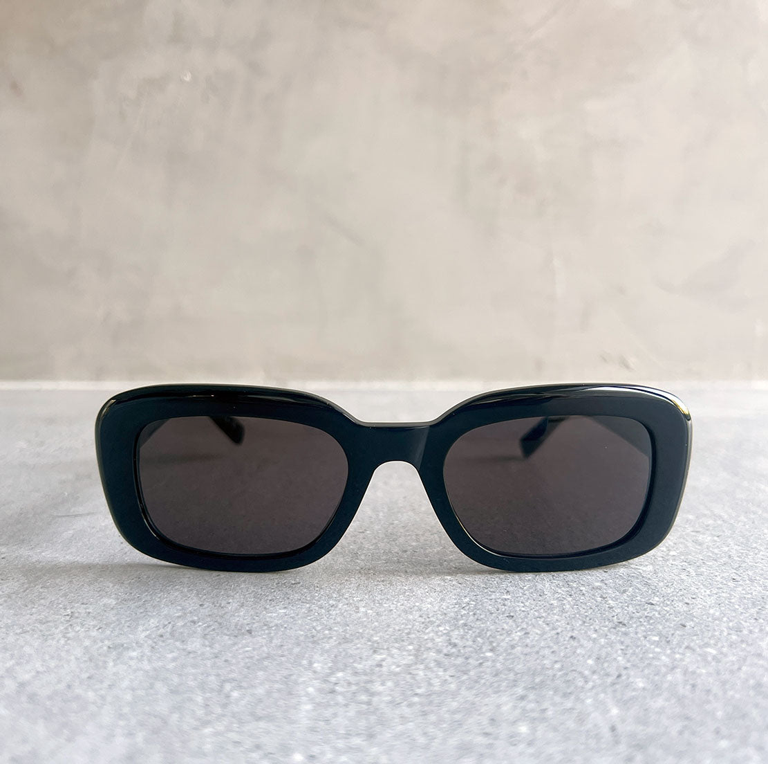 Pillowed rectangular sunglasses with acetate frames and nylon lenses.