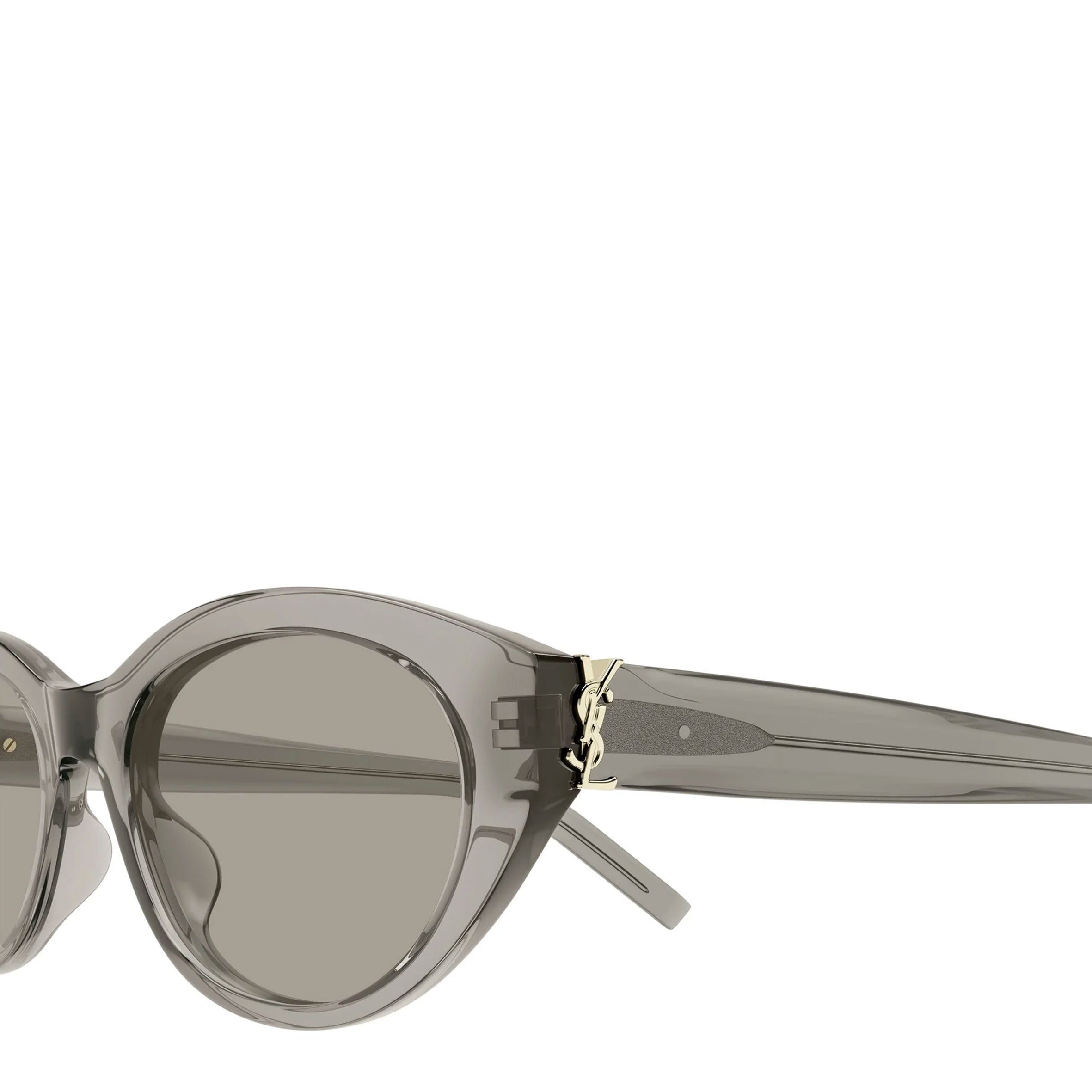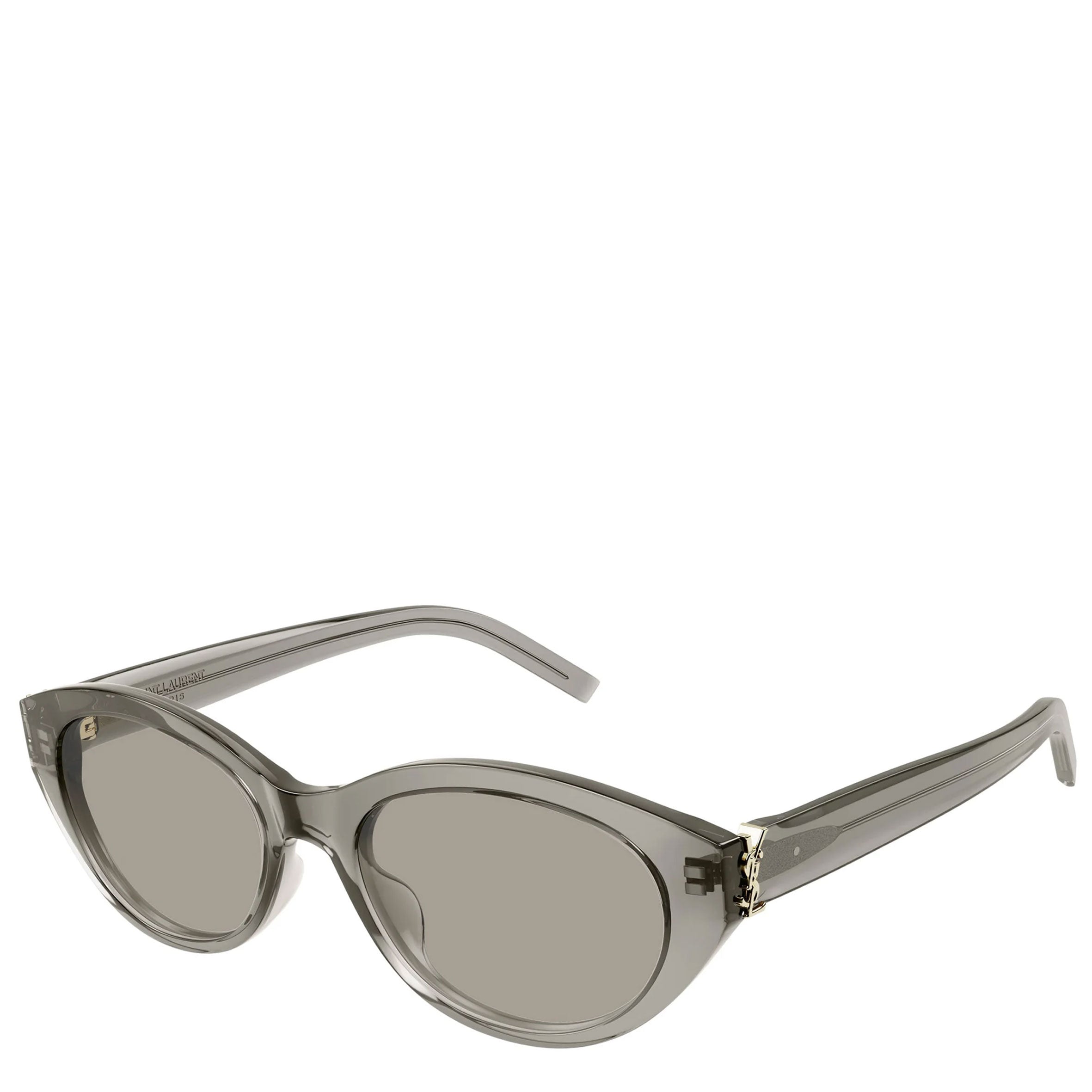 Saint Laurent SL M148/F 004 sunglasses for women, featuring shiny transparent taupe oval recycled acetate frame and solid warm grey bio nylon lenses. Cassandre Logo on temples.