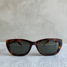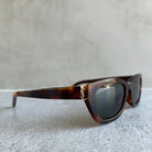 Saint Laurent SL M153 003 sunglasses for women, featuring shiny medium havana rectangular recycled acetate frame and solid grey bio nylon lenses. Cassandre Logo on temples.