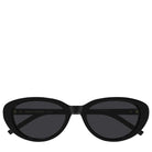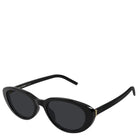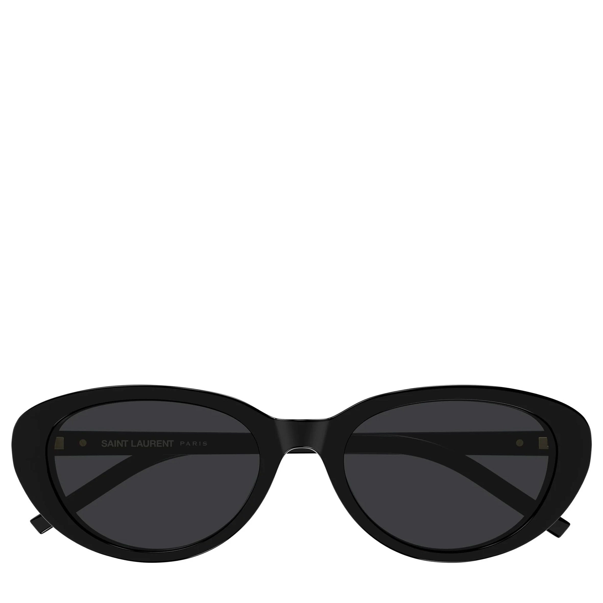 Saint Laurent SL M154 sunglasses for women, featuring shiny medium black oval recycled acetate frame and black bio nylon lenses. Cassandre Logo on temples.