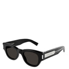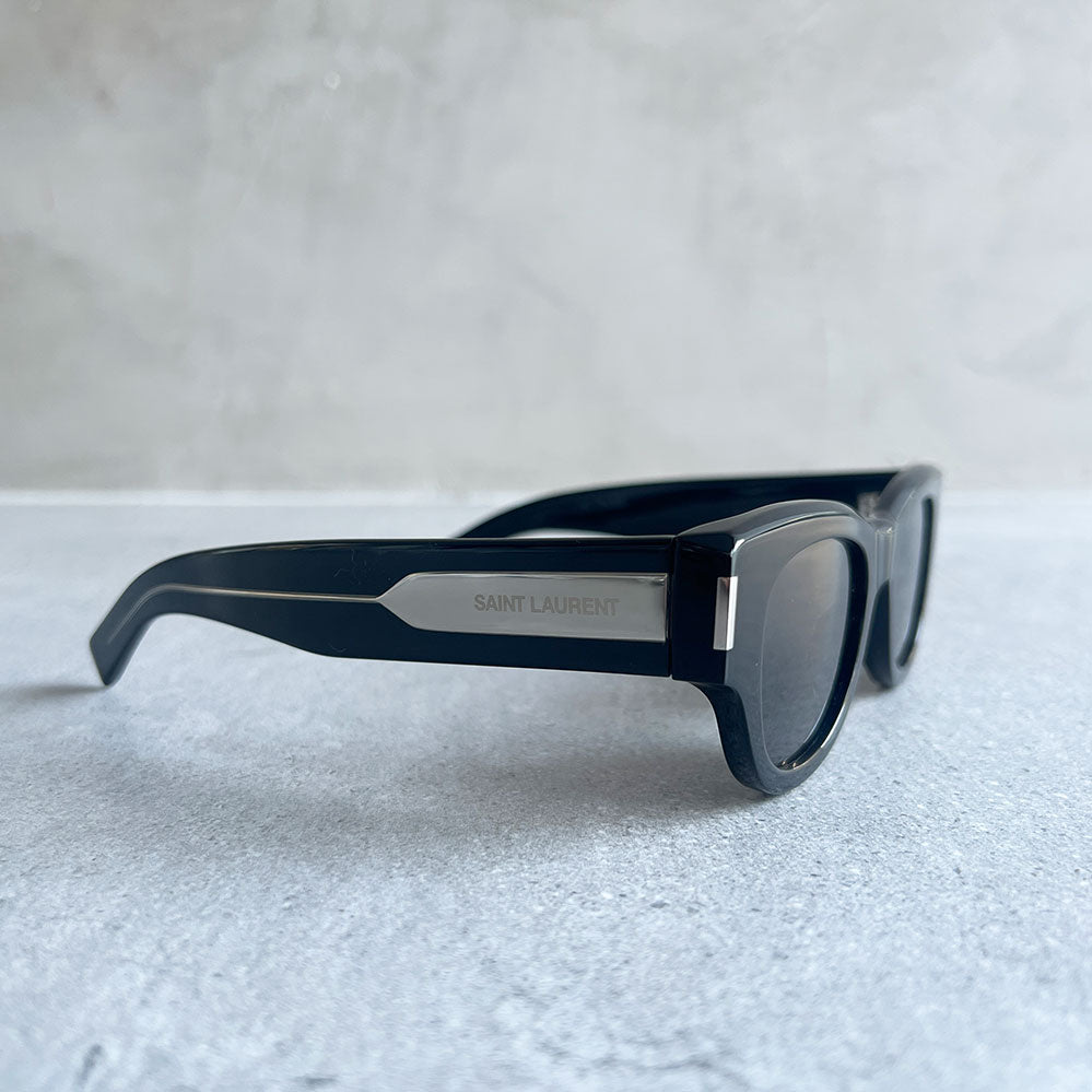 A new season oversized cat-eye inspired acetate frame style from Saint Laurent. Crafted in a black acetate, this style features grey tinted lenses, naked wirecore arms and lasered Saint Laurent logo.