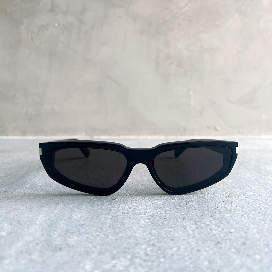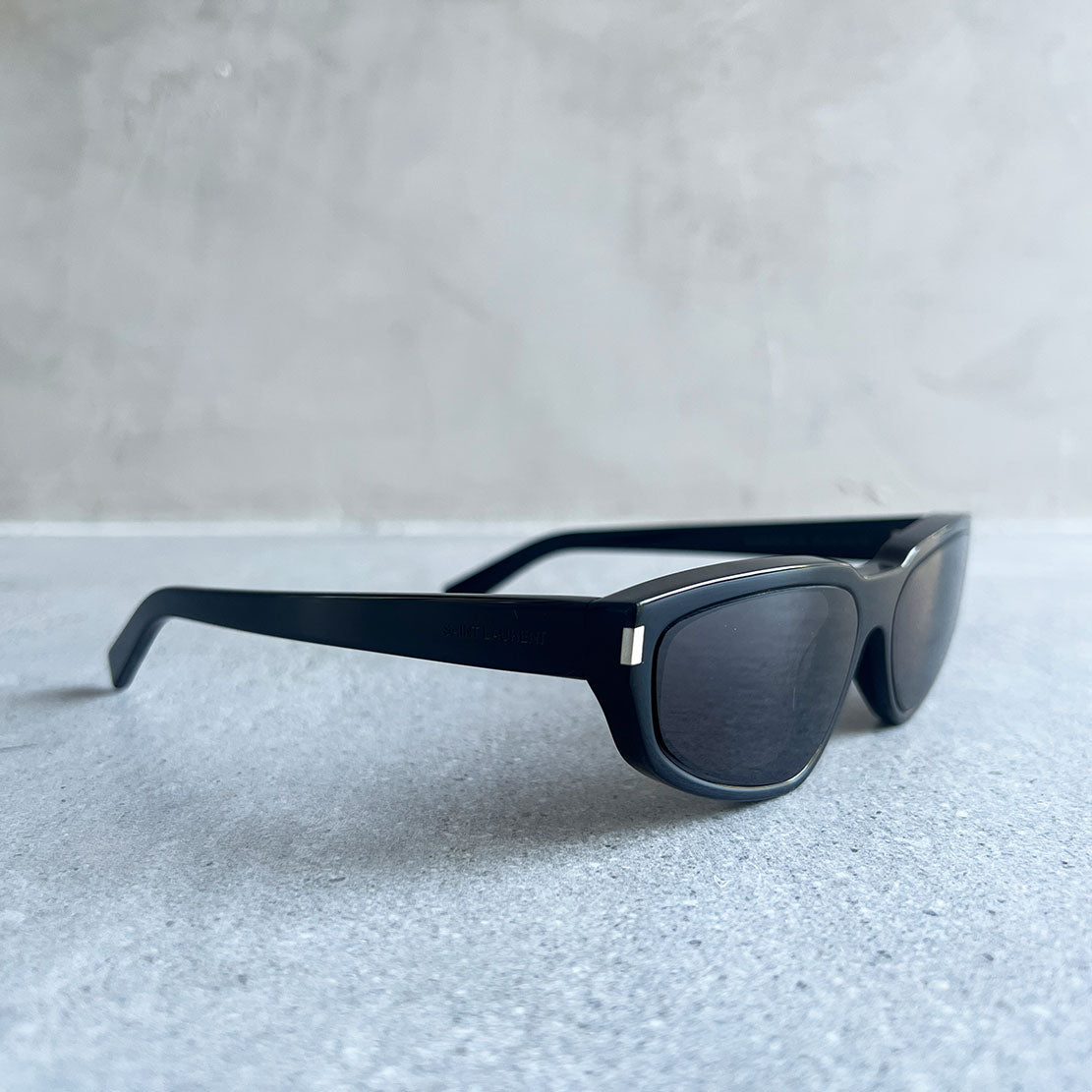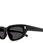 A narrow cat-eye shape with iconic Saint Laurent corner angle and lenses aligned to the acetate front. The Saint Laurent logo is laser engraved on both temples.