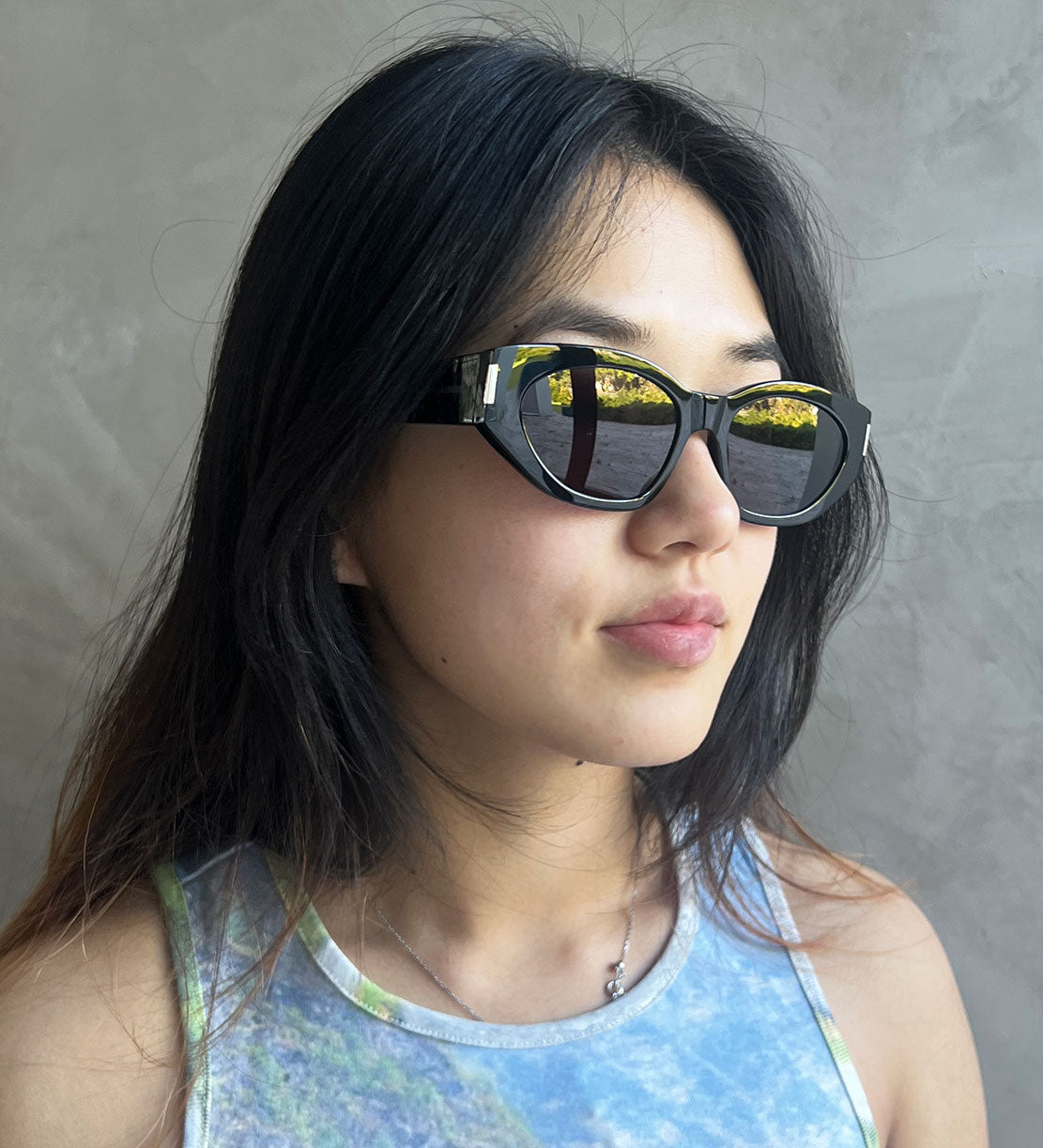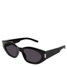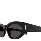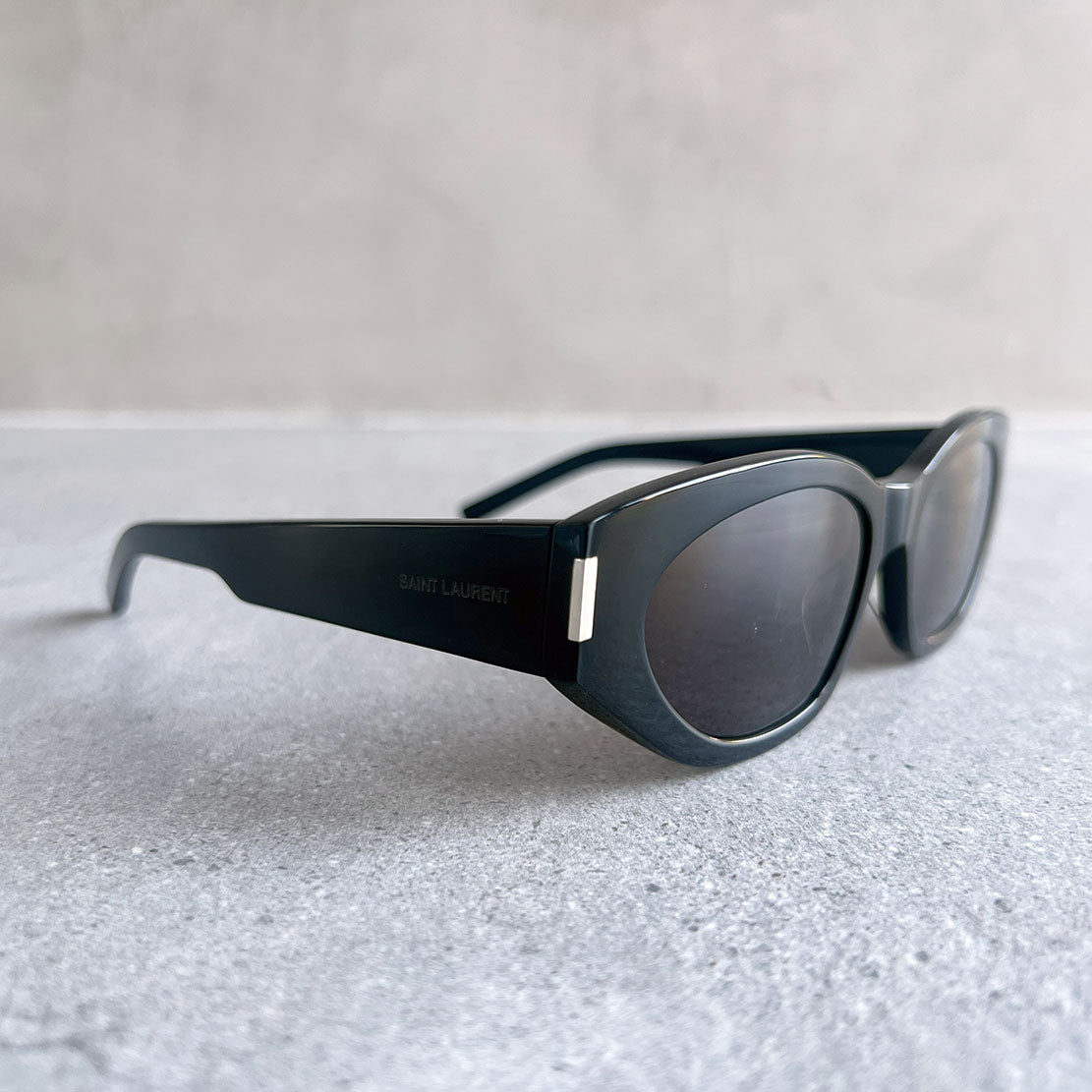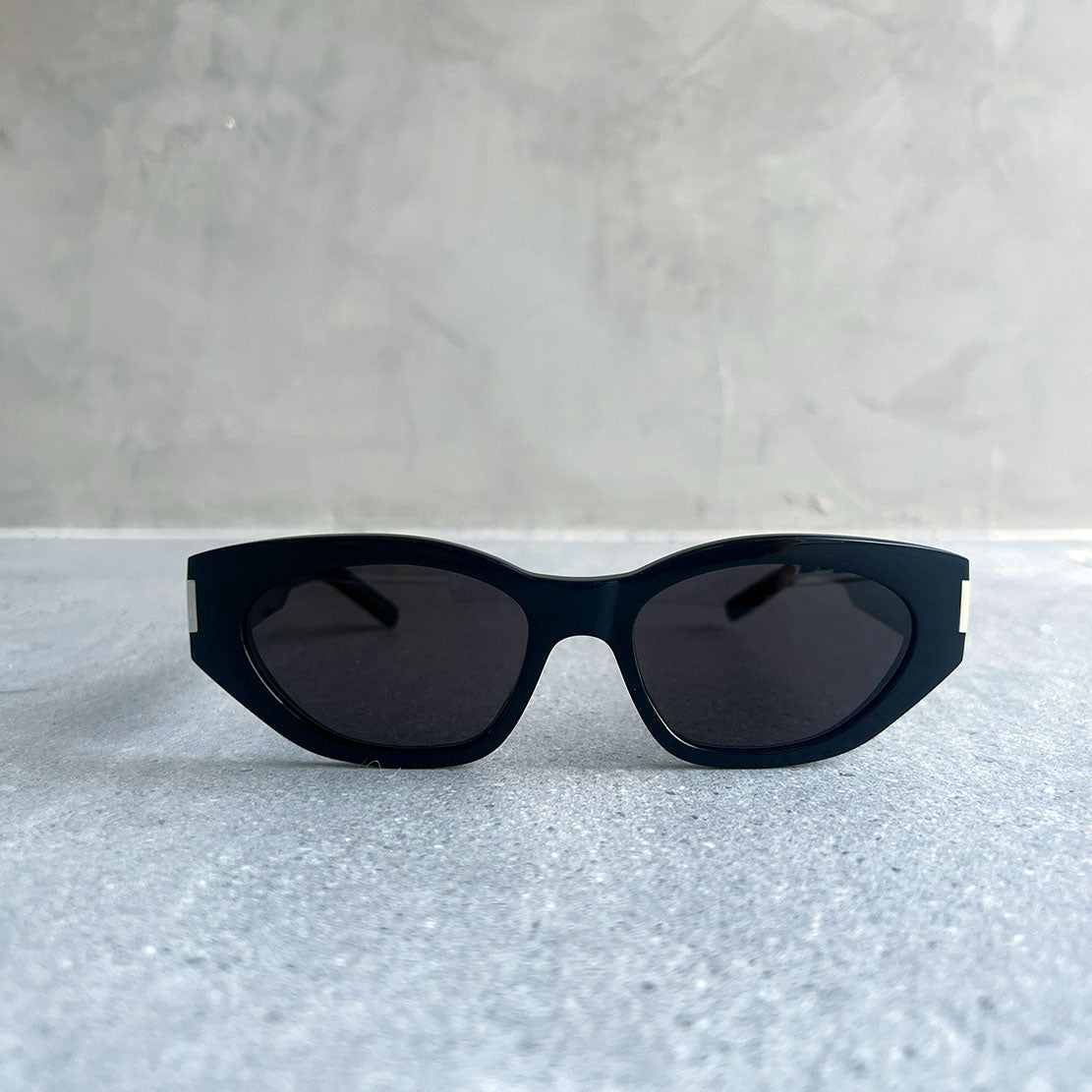 A narrow cat-eye with bold acetate frames and iconic corner angle detail. The Saint Laurent logo is laser engraved on both temples.